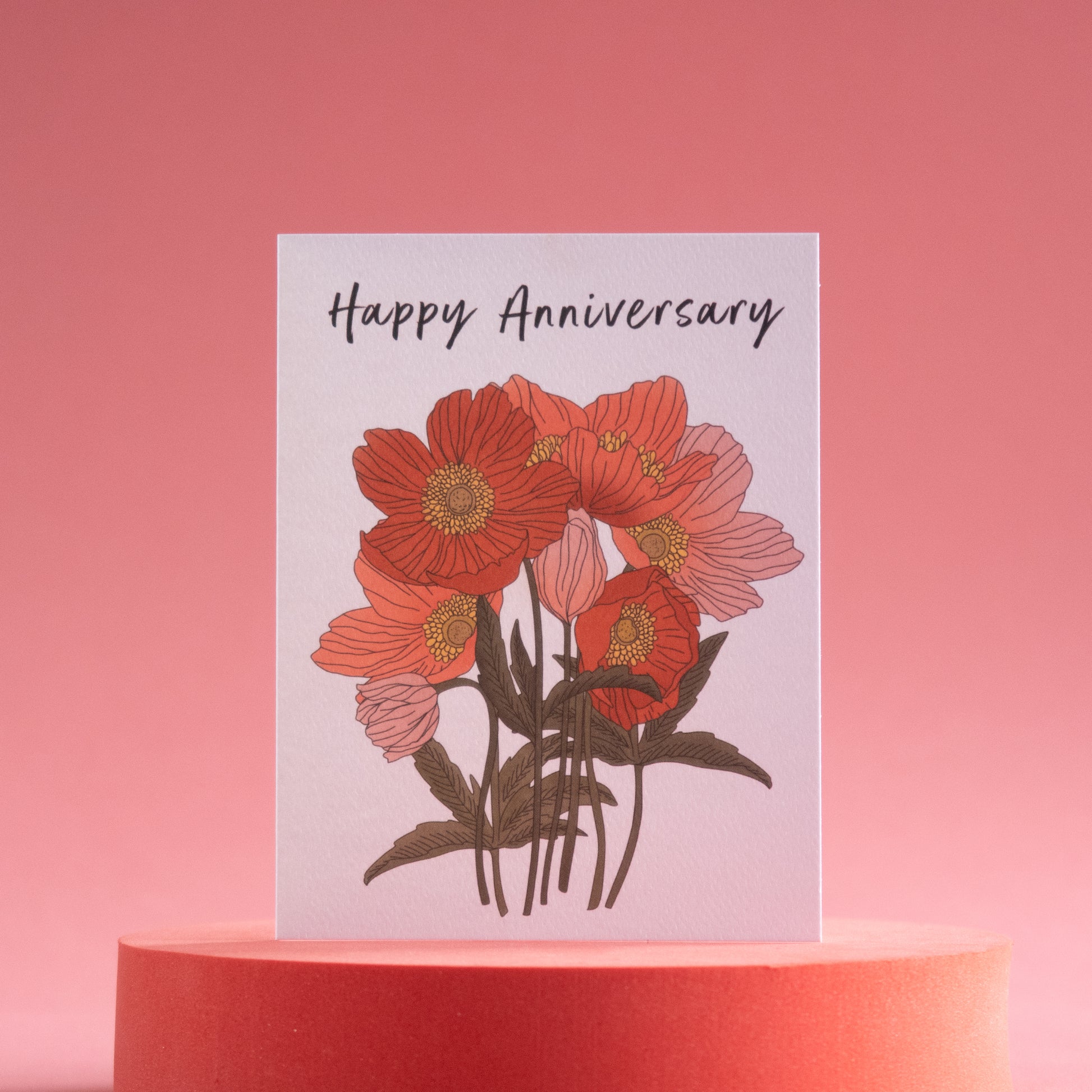 Celebrate your love story with our beautiful anniversary card, adorned with vibrant poppies. The elegant black text simply says, 'Happy Anniversary'