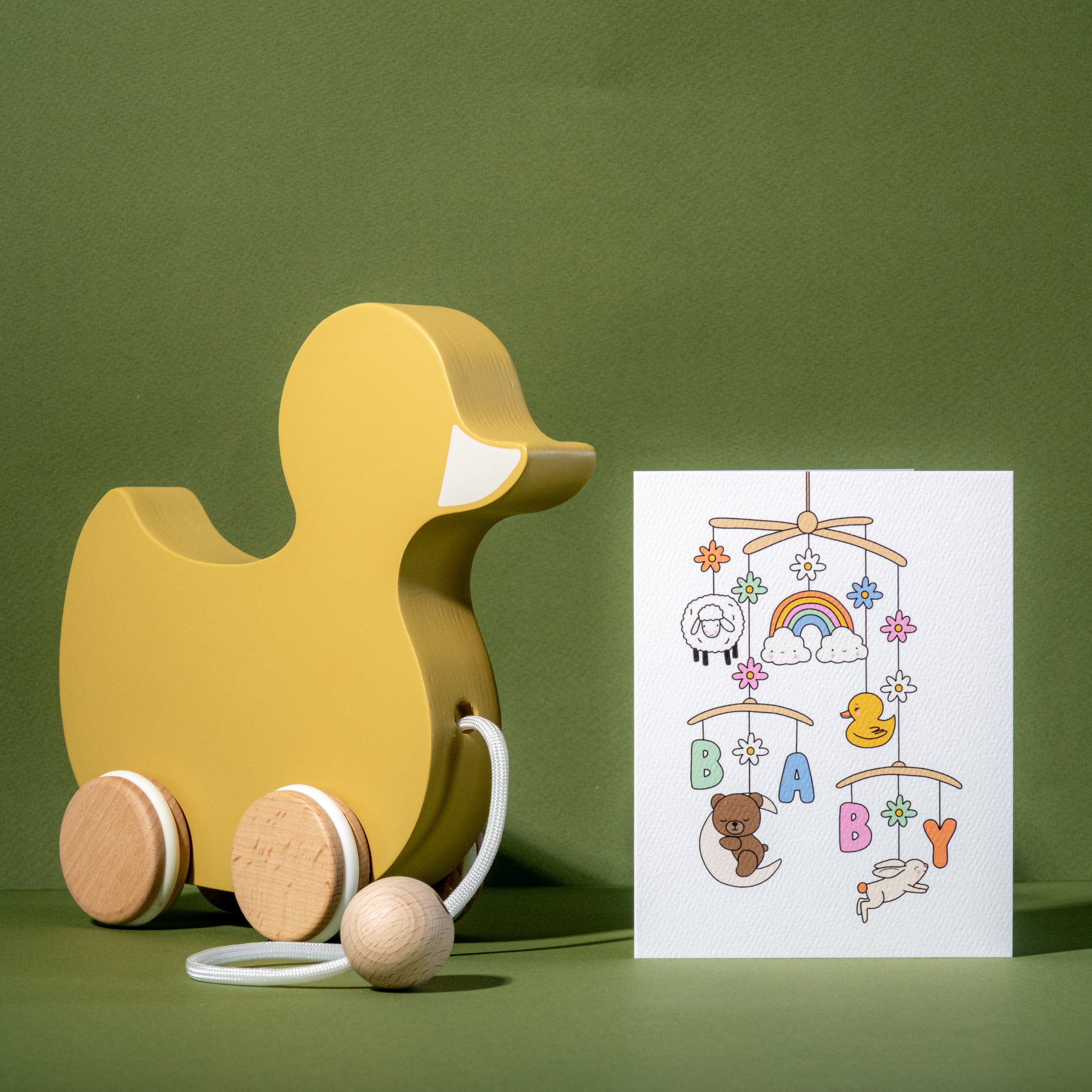Introducing our charming Baby Mobile Greeting Card, the perfect way to welcome a precious bundle of joy into the world! Adorned with a delightful illustration of a whimsical baby mobile, this card captures the innocence and wonder of infancy