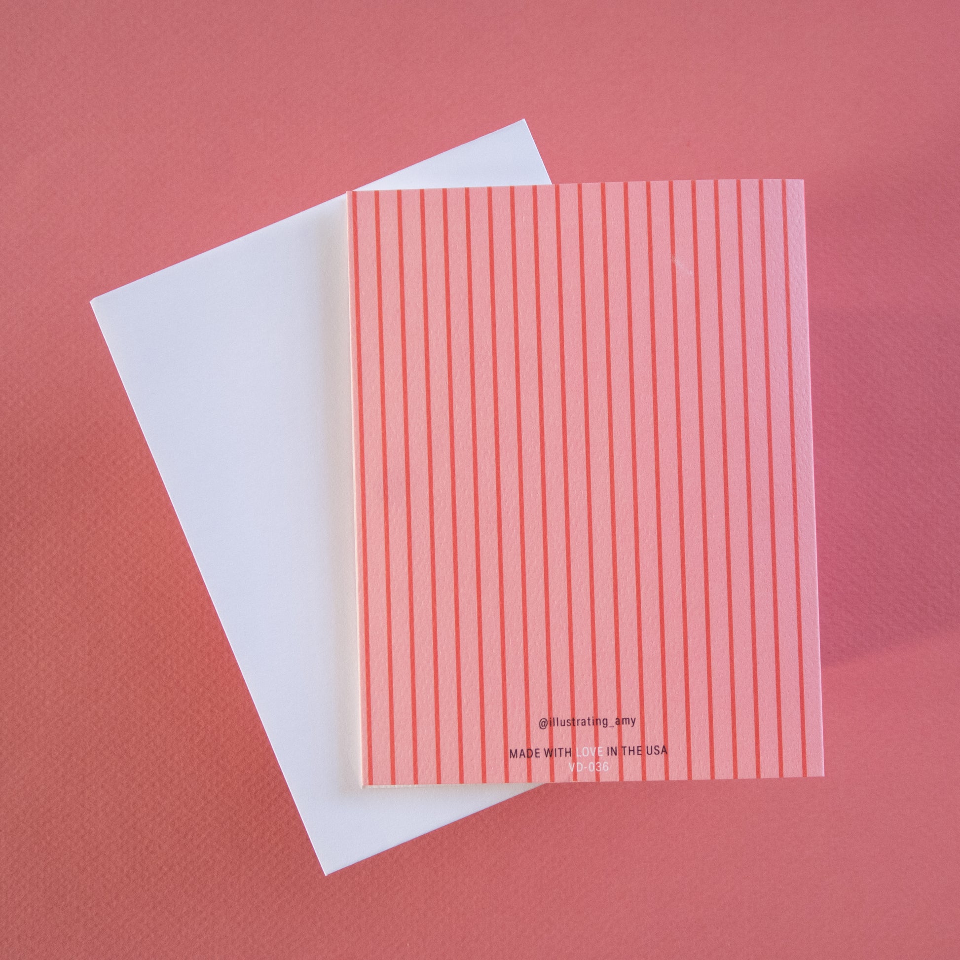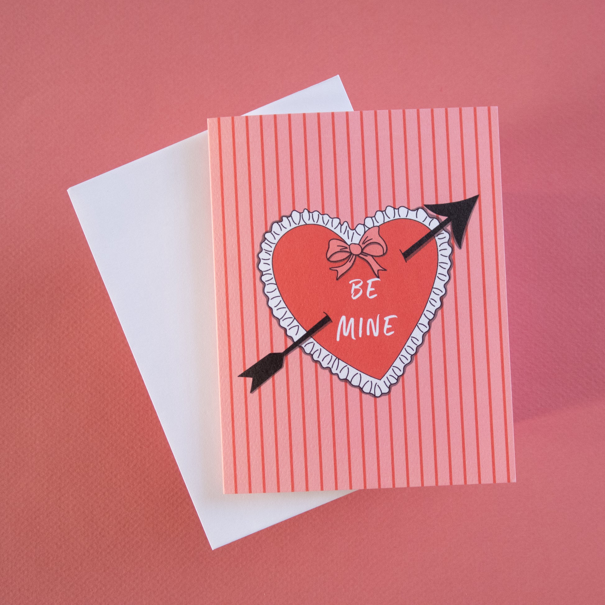 Give the gift of love with our 'Be Mine' Valentine's Day Card. A delightful red heart with white frills stands against a charming pink background adorned with red stripes, creating the perfect token of affection. Let your heart speak with the sweet message, 'Be mine.'