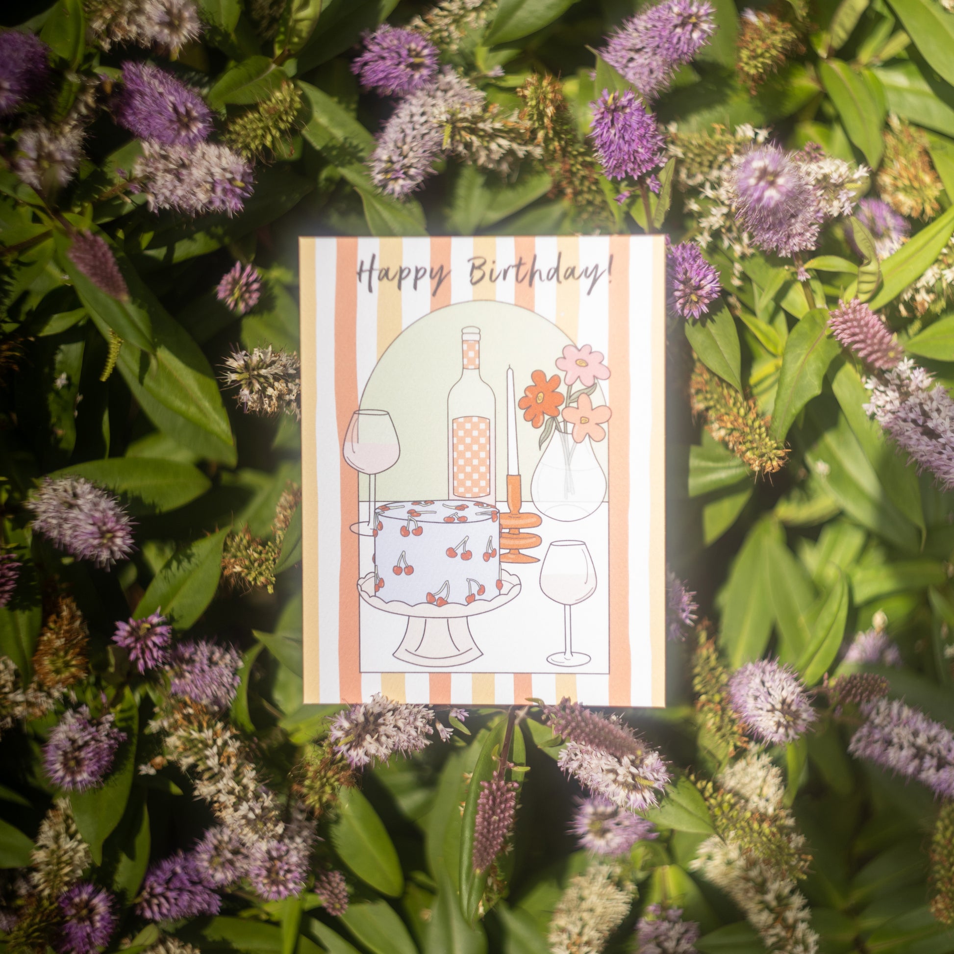 Time to celebrate in style! Featuring a charming scene with a blue cake topped with cherries, a bottle of wine, and a beautiful bouquet of flowers.The striped background adds a touch of whimsy to the design. Send your warmest wishes with this delightful card and make their birthday truly special.