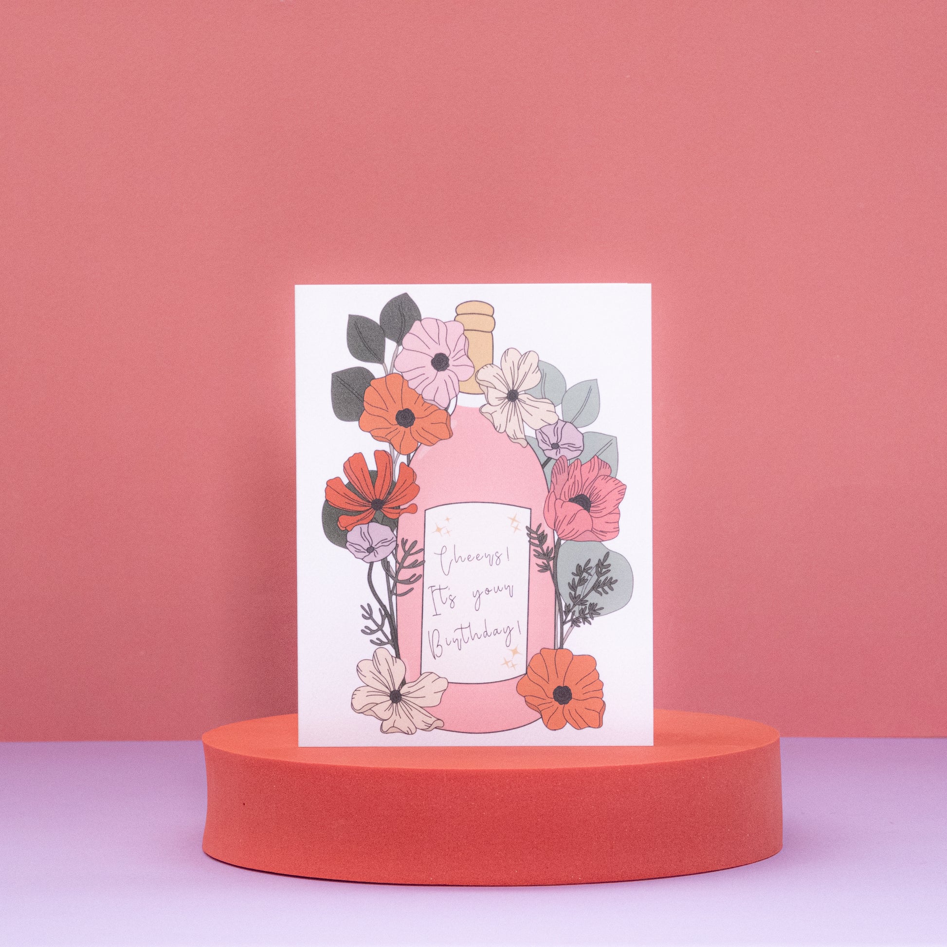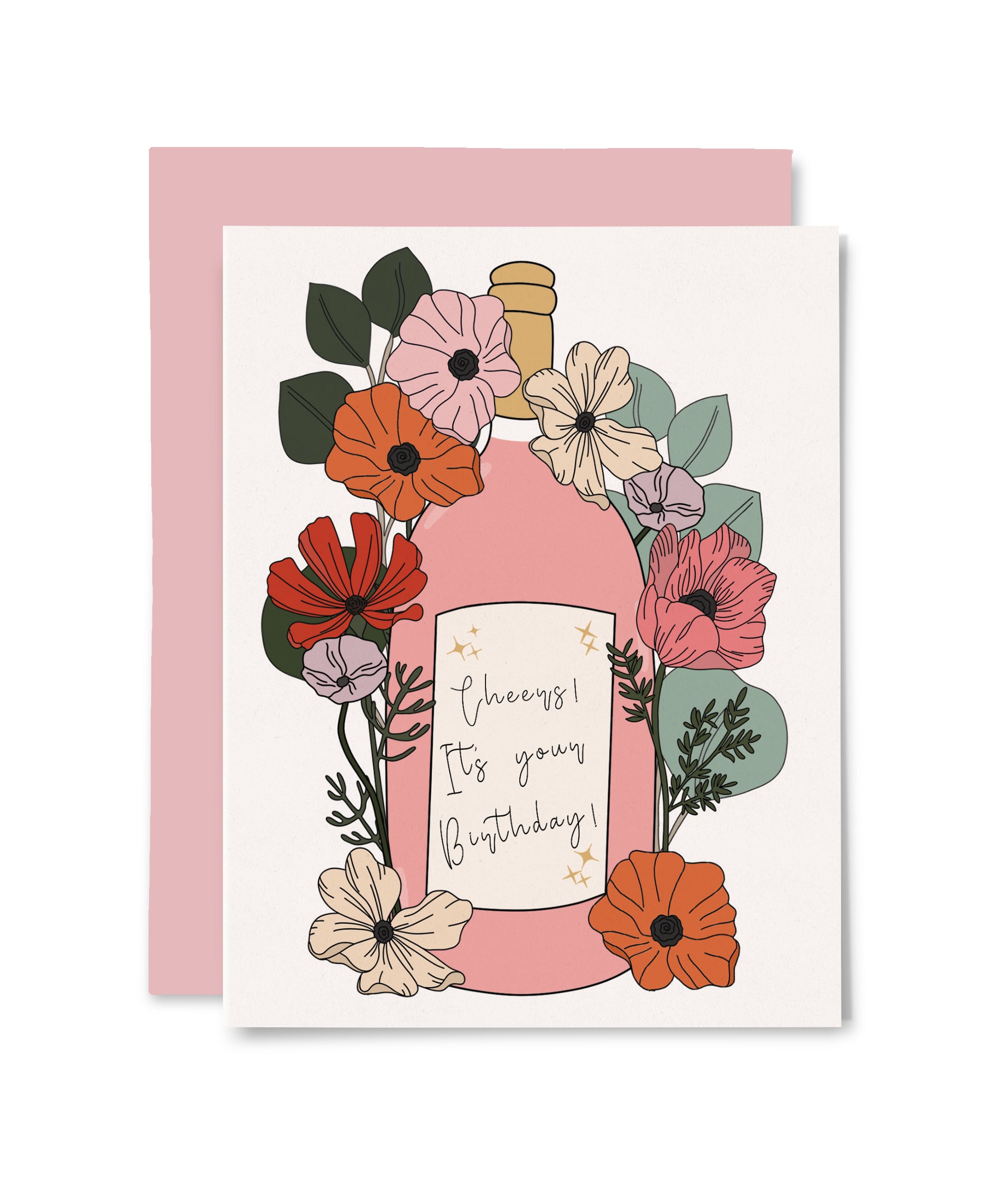 Cheers to another year! Our Happy Birthday card featuring an illustration of a bottle of wine with beautiful flowers surrounding it is the perfect way to celebrate their special day. The crisp white background makes the colorful and vibrant design pop, while the pink envelope adds an extra touch of fun. The text simply reads "Cheers! It's your Birthday".