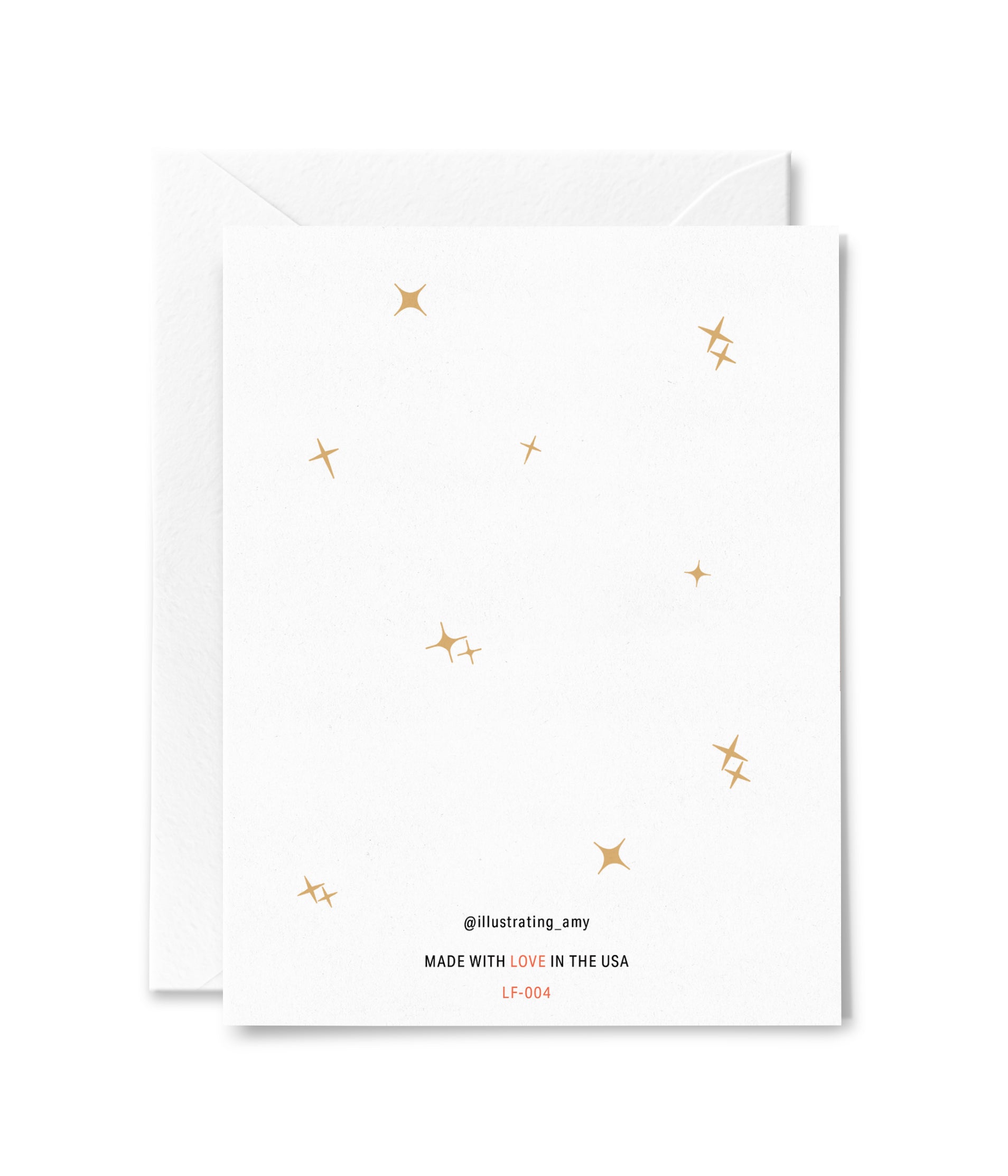 Cheers to any occasion with our versatile Celebration Cheers card! Featuring an illustration of three friends joyfully raising their cocktails in celebration, this card is perfect for birthdays, anniversaries, graduations, or any special moment worth toasting. Set against a cream background with scattered gold stars, it exudes a touch of elegance and festivity.
