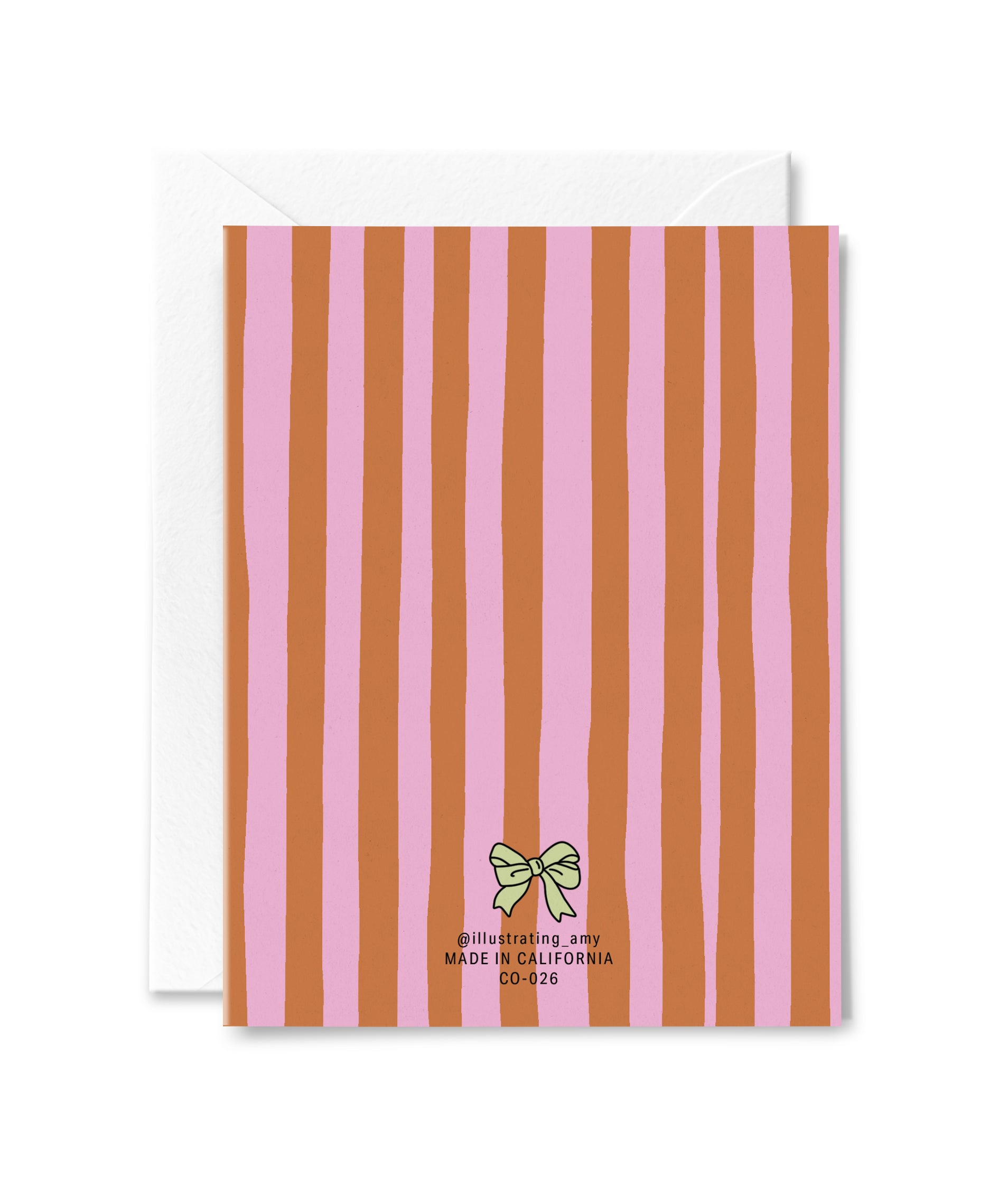 Raise a glass and celebrate life’s happiest moments with this playful champagne card. Featuring two clinking glasses tied up with colorful bows and surrounded by a bold striped border, it’s the perfect way to toast birthdays, engagements, anniversaries, or any special occasion worth celebrating. Blank inside for your personalized message, it comes with a matching envelope and is printed on high-quality card stock.