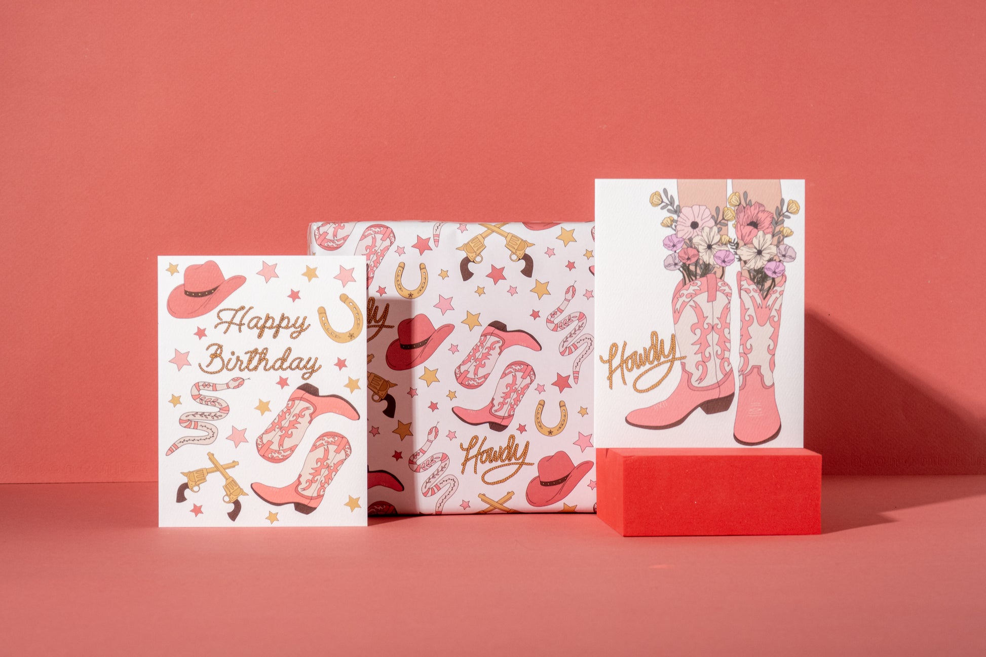 Introducing our Cowgirl-themed wrapping paper sheets, packaged in a set of three and measuring 20" x 29" each, elegantly rolled and presented in a cellophane tube. Bring a touch of Western flair and feminine style to your gift-giving with this charming design! Featuring pink cowboy boots, Stetson hats, and gold horseshoes, this wrapping paper is perfect for any occasion. With a friendly "Howdy" greeting in rope-style text, it's sure to make a memorable impression. Wrangle up your gifts in style and delight your recipients with a touch of whimsy and Western charm!