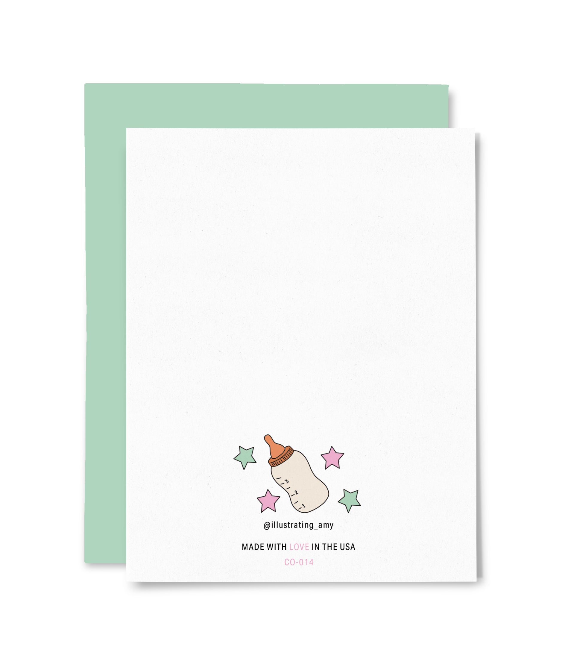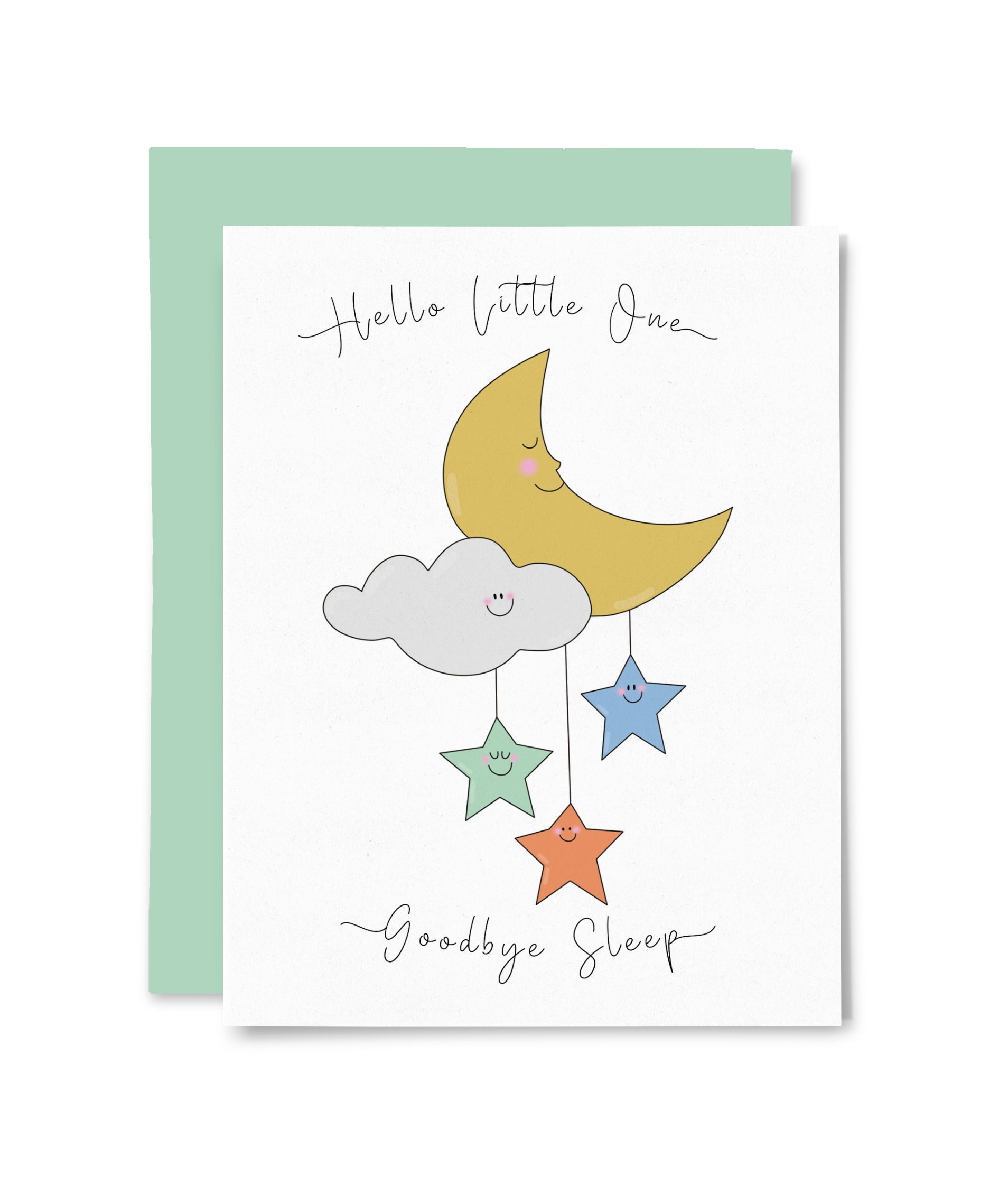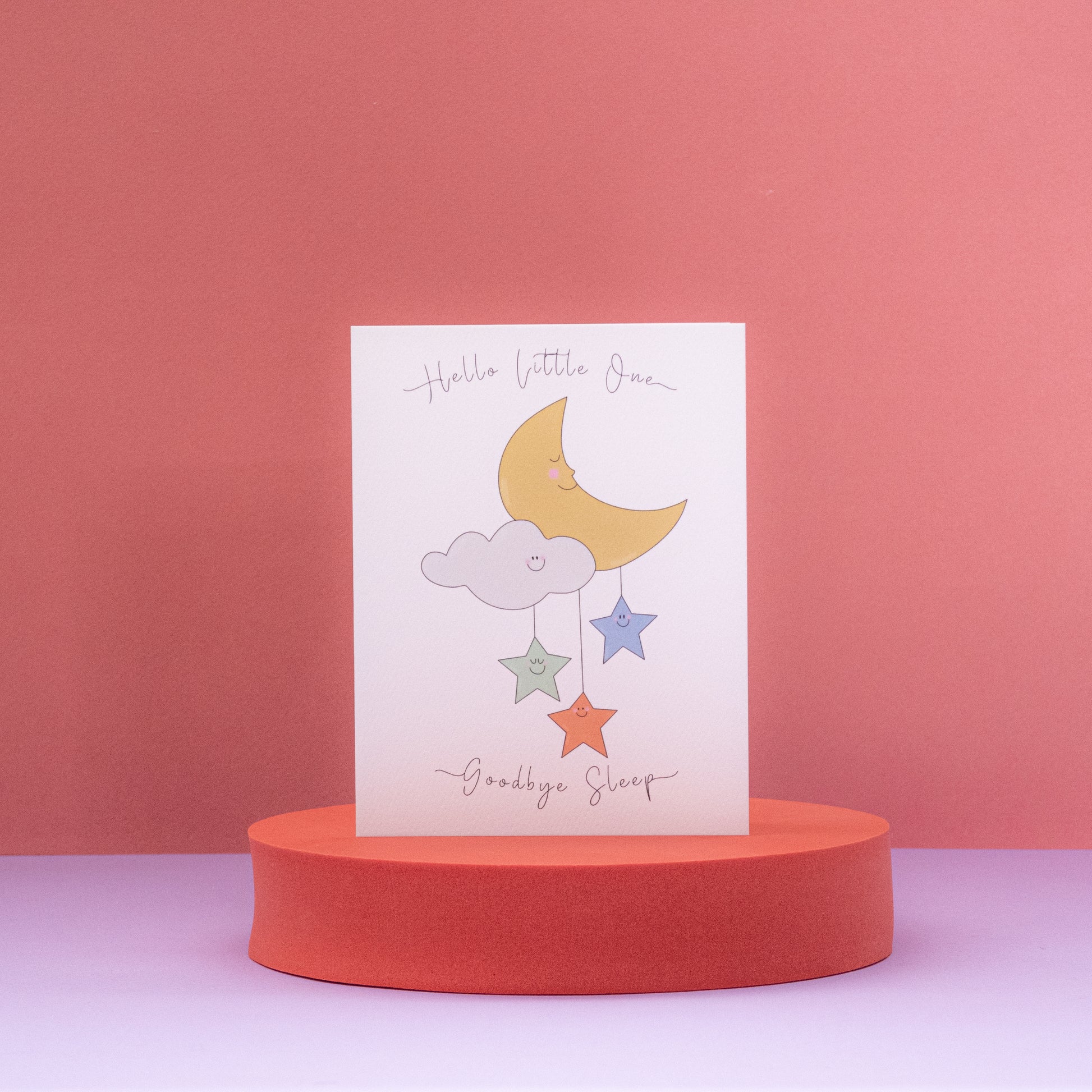 Welcome the little bundle of joy with our whimsical Hello Little One card! Featuring an illustration of a charming baby mobile, adorned with stars and moon, this card captures the enchantment of a new arrival. In black text, it reads "Hello Little One, Goodbye Sleep," humorously acknowledging the adventure that awaits the new parents.