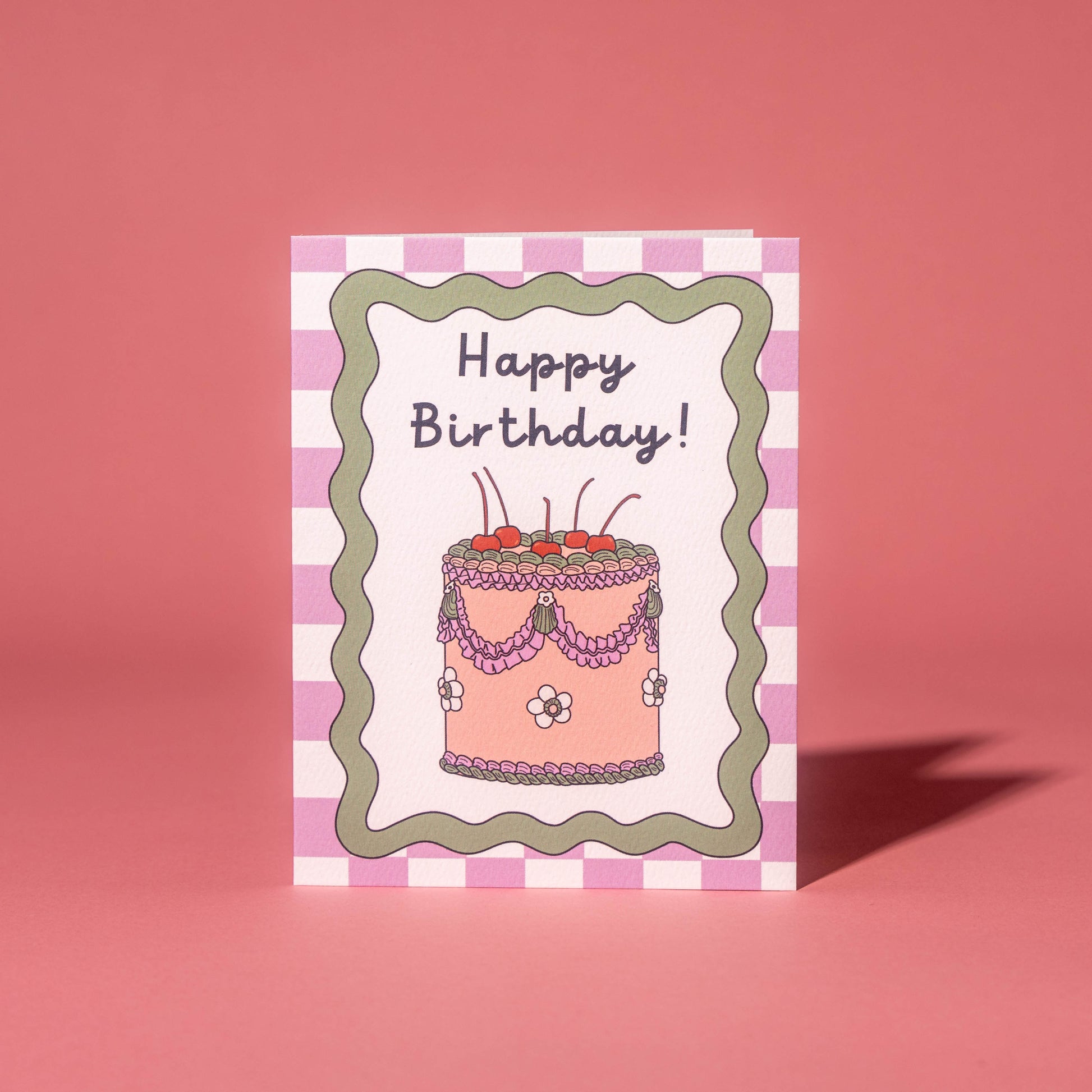 Make their birthday extra special with this uniquely illustrated card featuring a vintage-inspired cake topped with cherries and decorated with floral details. The playful checkerboard border and wavy green frame add a fun, retro twist to this charming design.