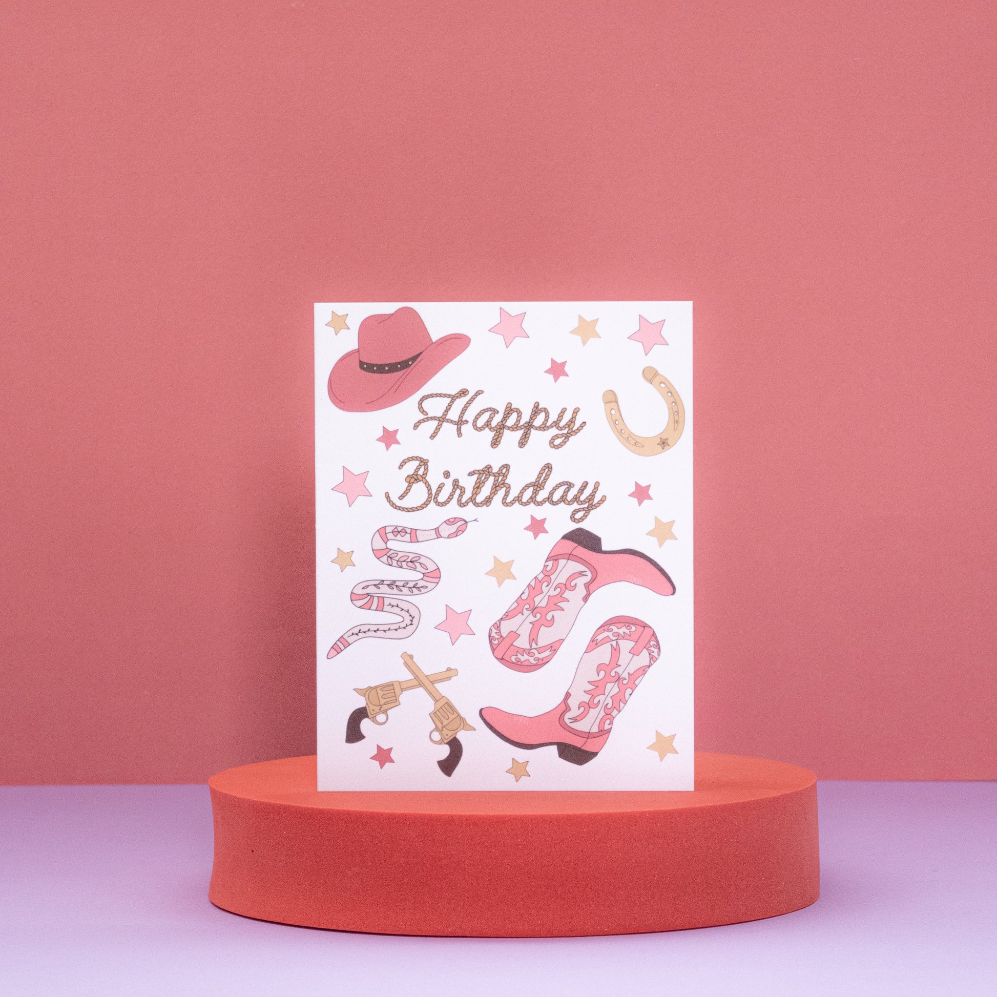 Yeehaw! Saddle up and celebrate with this Cowgirl Birthday card. Featuring illustrations of pink cowboy boots, Stetsons, and gold horseshoes, with rope-style text that reads "Happy Birthday" on a rustic brown background. And to make it even more special, this card comes with a pink envelopes to complete the look.