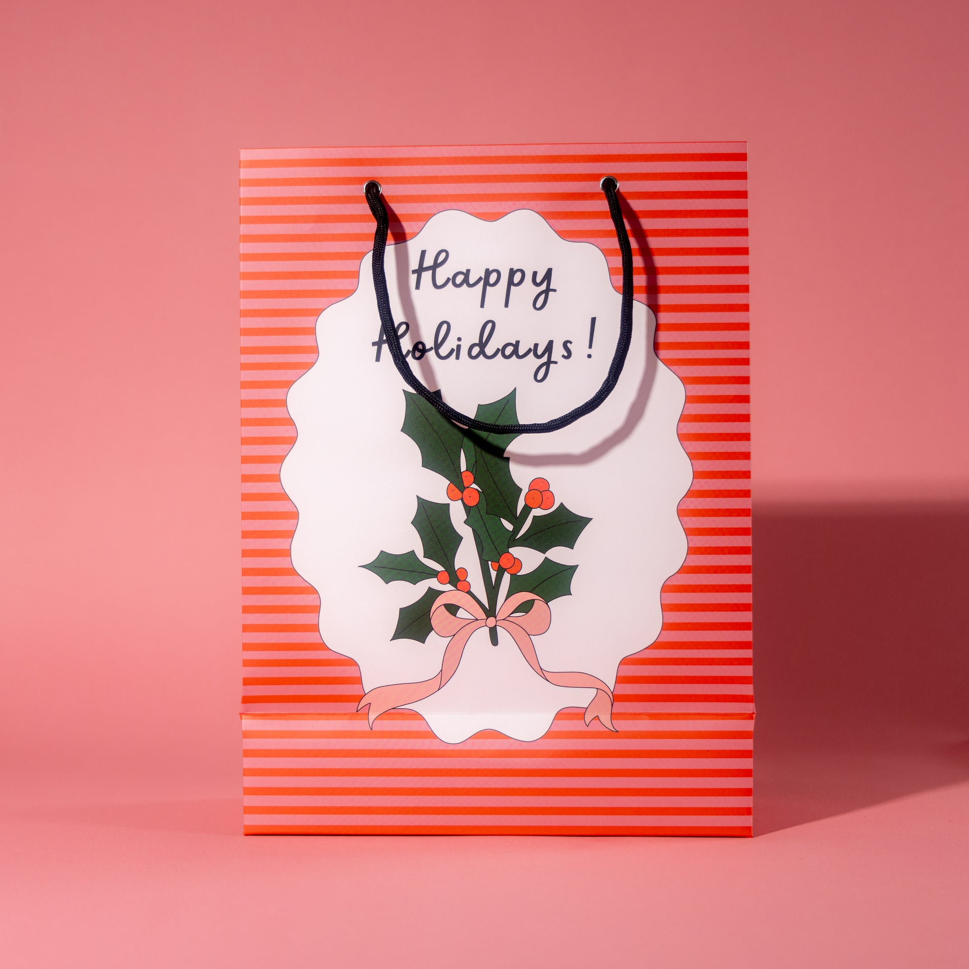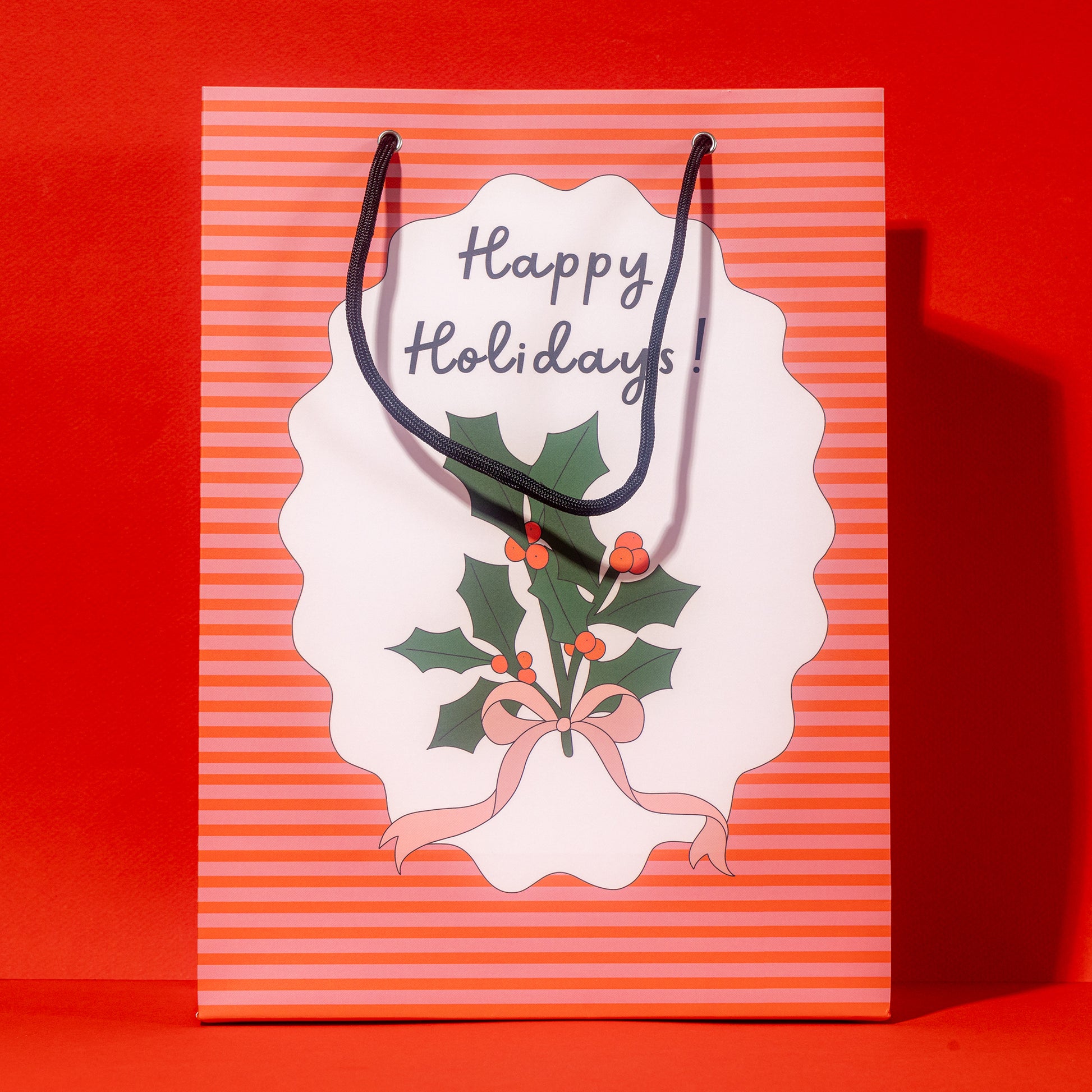 Featuring a beautifully illustrated sprig of holly tied with a pink ribbon, the bag captures the festive spirit with its detailed and vibrant artwork. The holly sprig pops against a backdrop of red and pink stripes, creating a stylish and eye-catching design that's perfect for the holiday season.