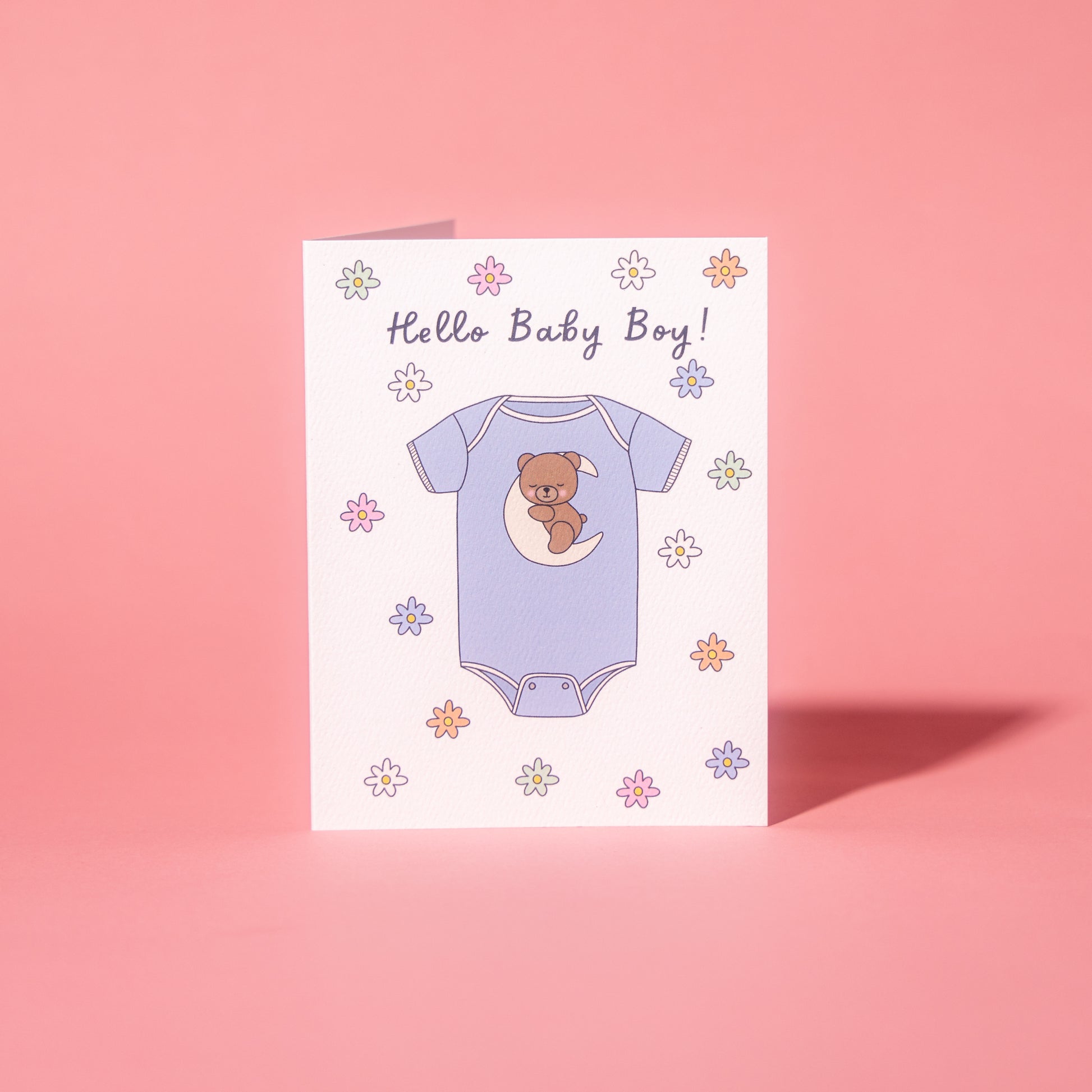 Welcome the newest little one with this sweet "Hello Baby Boy!" card. Featuring an adorable baby onesie in soft blue with a cuddly teddy bear resting on a crescent moon, this design captures the warmth and joy of a newborn’s arrival. Surrounded by colorful flowers, it’s perfect for celebrating a new baby and sending love to the proud parents.