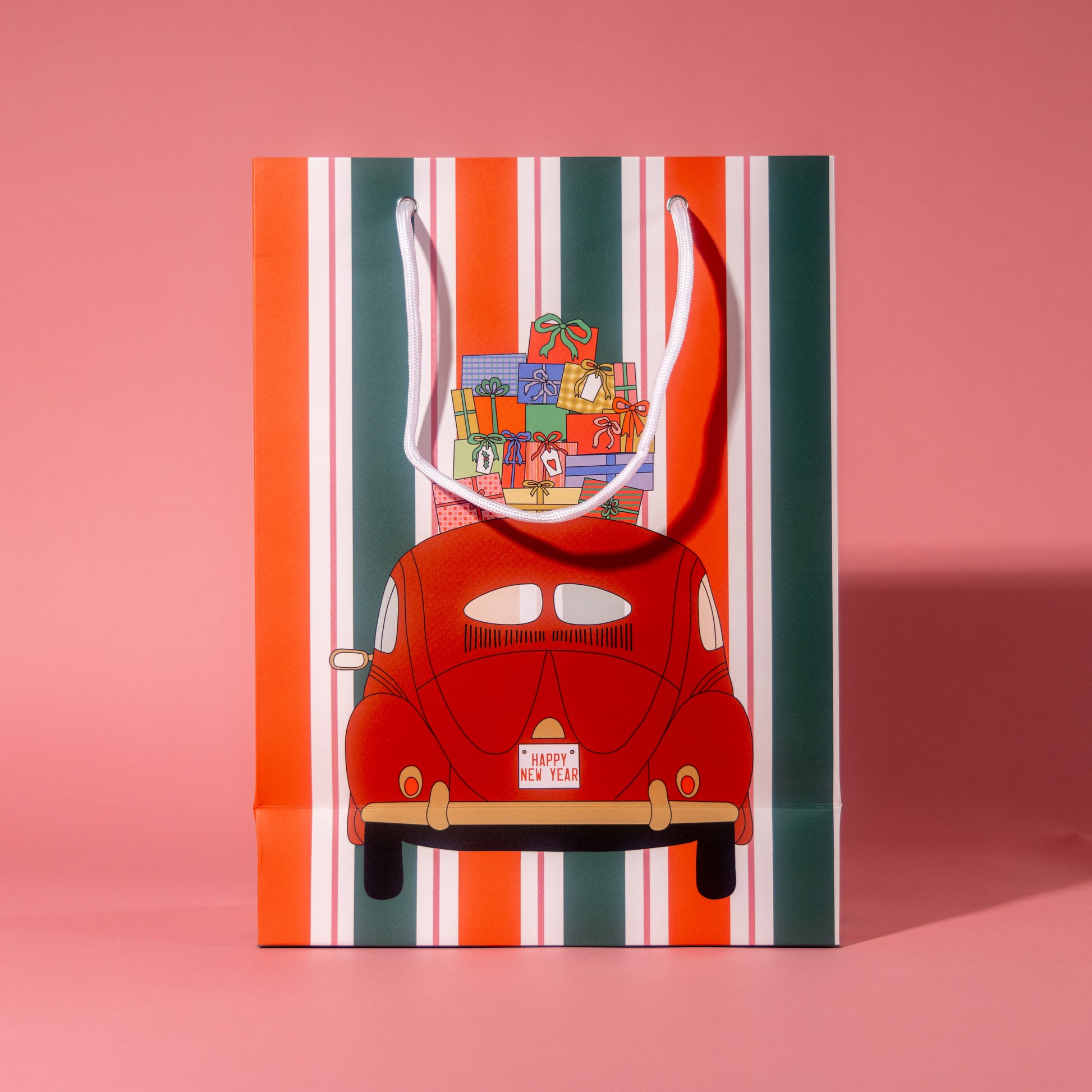 Get ready to ride into the holiday spirit with our delightful "Holiday Beatle" gift bag. Featuring a whimsical illustration of a classic Volkswagen Beetle piled high with beautifully wrapped presents set against a striped background. The charming design captures the essence of festive celebrations, evoking the simple pleasures and the true spirit of giving.