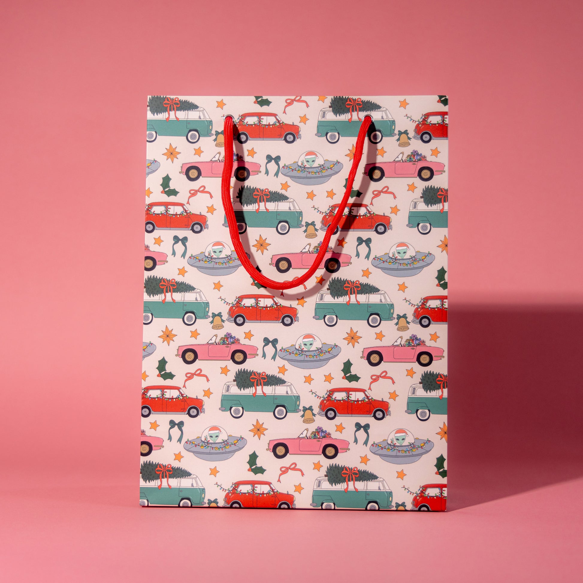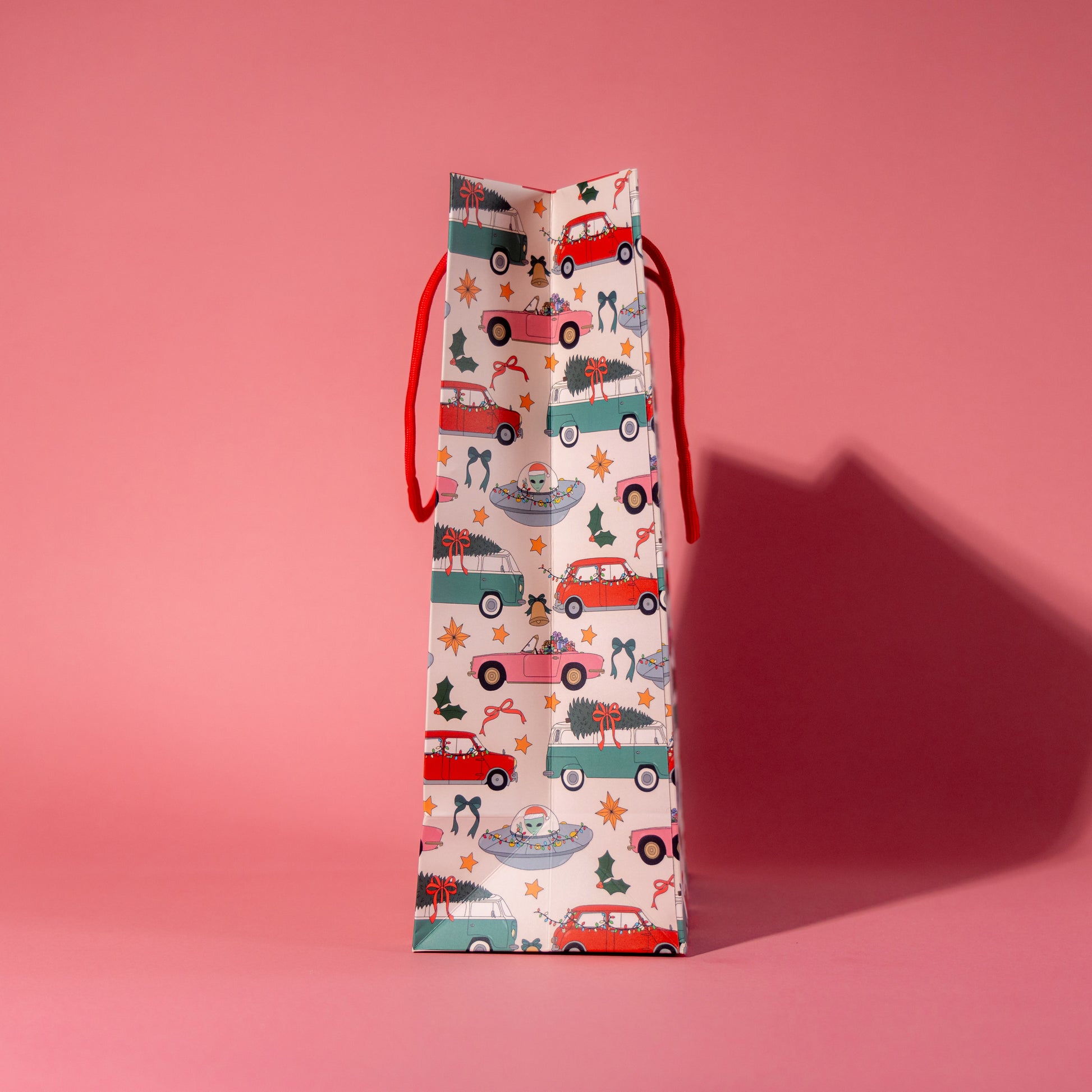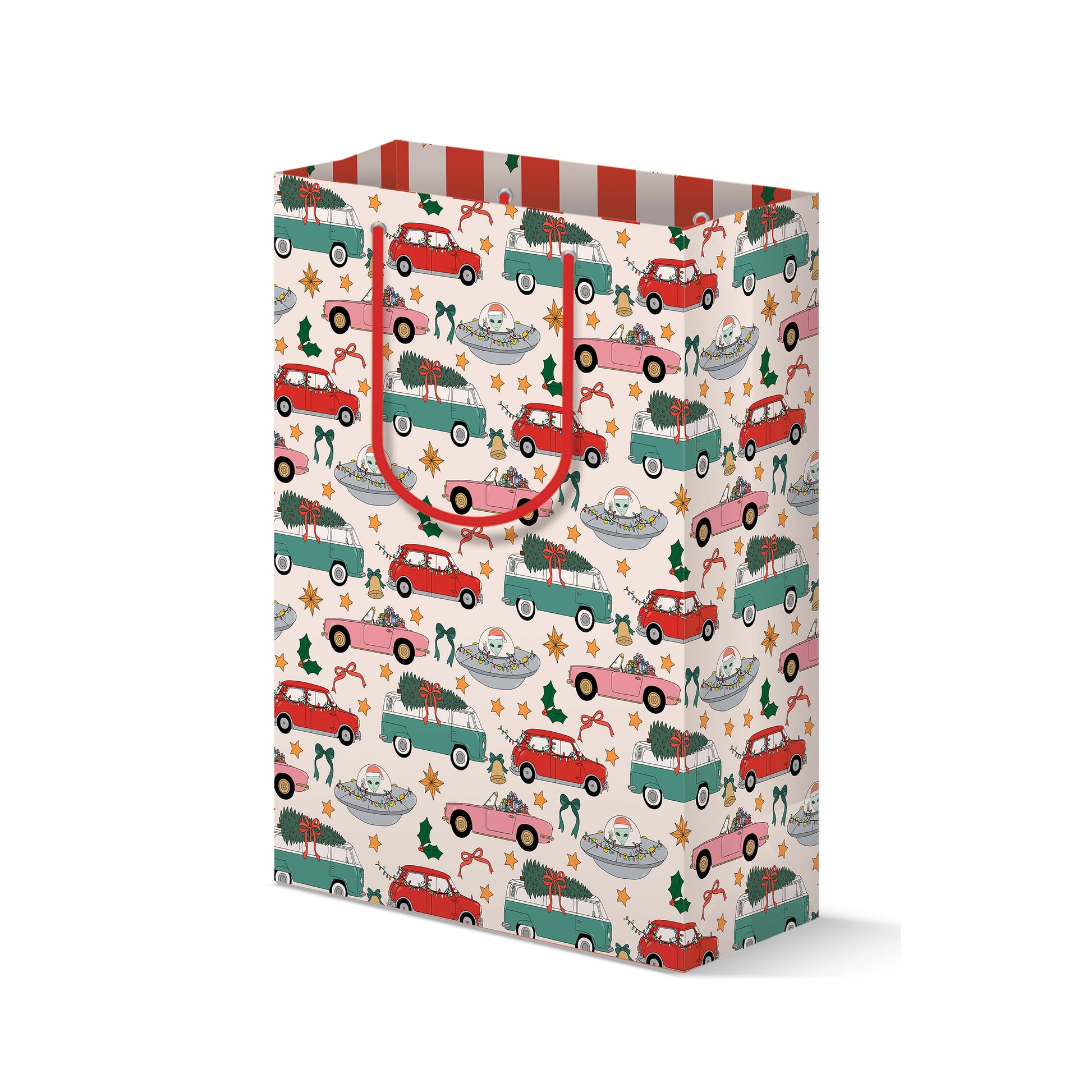 Unwrap the joy of the season with our festive gift bag, adorned with a delightful parade of cars twinkling with holiday lights, trees brimming with Christmas cheer, and gifts wrapped in wonder. Adding a touch of whimsy, a Santa alien weaves magic throughout the design, bringing a cosmic twist to traditional holiday fun. Perfect for making your presents as exciting on the outside as they are on the inside, this bag captures the essence of holiday adventure and festive spirit!