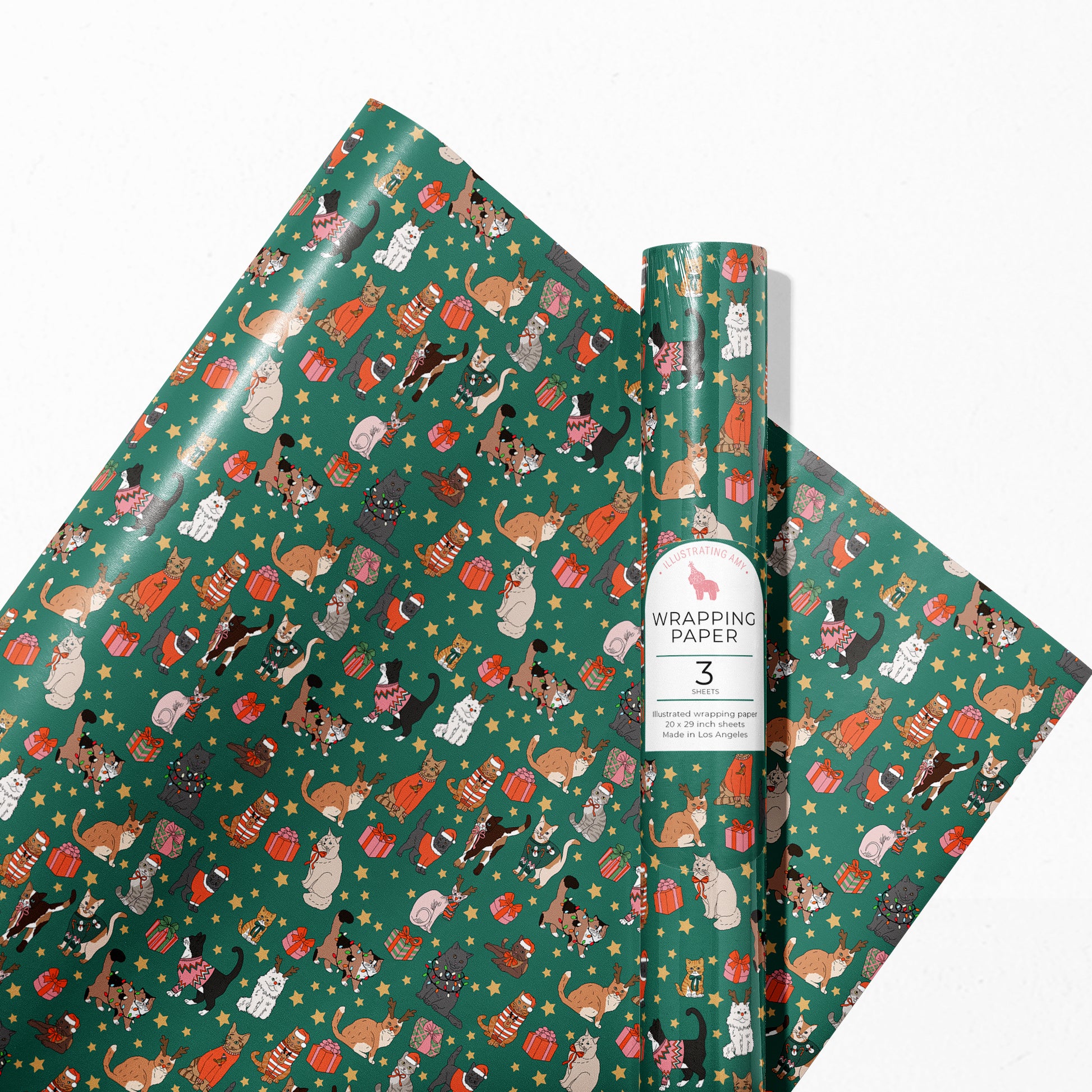 Our wrapping paper features a playful and festive design with charming illustrations of various cats dressed in holiday sweaters, Christmas hats, and wrapped in Christmas lights, all against a vibrant background adorned with stars and gift boxes. The rich, colorful design captures the spirit of the season and adds a whimsical touch to your presents.