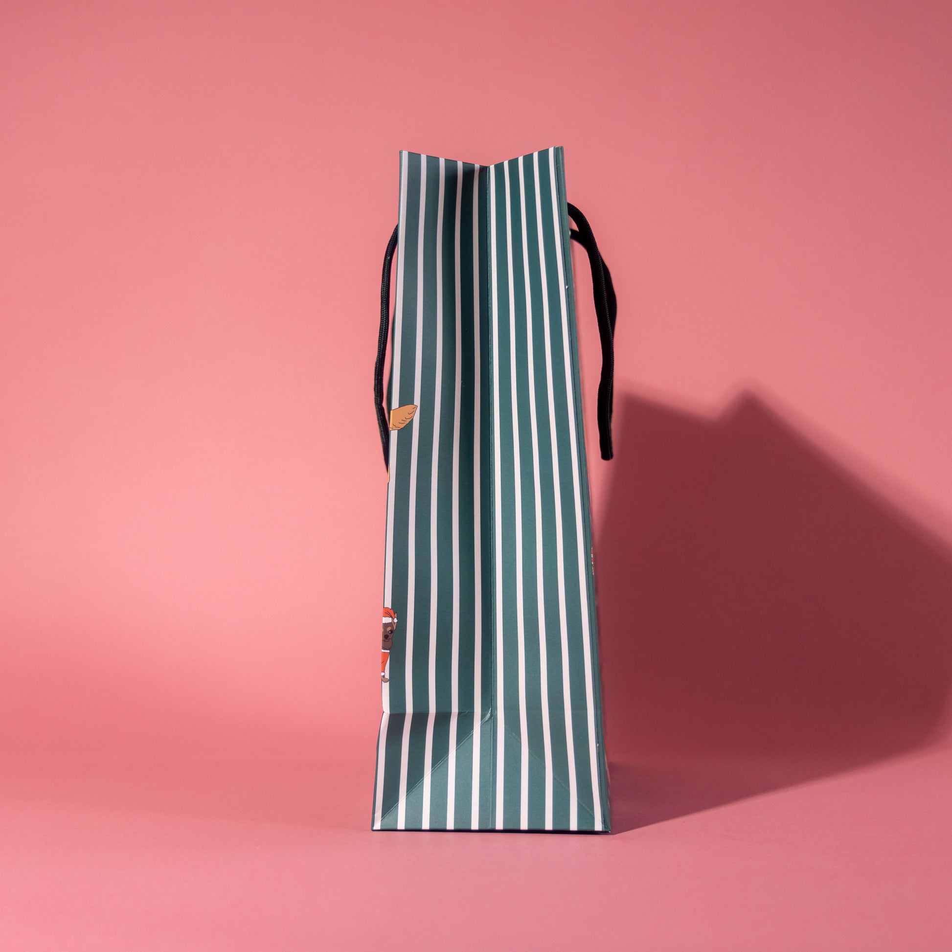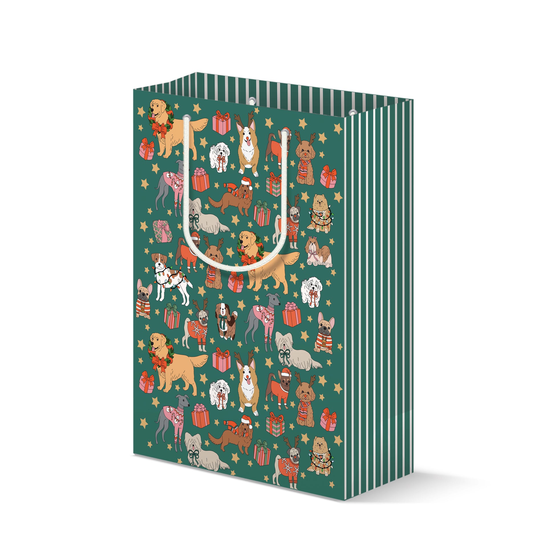 Spread holiday cheer with our adorable "Happy Holidays" gift bag, featuring a charming dog-themed design. Set against a festive green background with crisp white stripes, this bag is a delightful way to send a bit of joy and canine charm to your loved ones. Perfect for any dog lover, this gift bag adds a playful touch to your holiday celebrations, making your presents as heartwarming on the outside as they are inside!