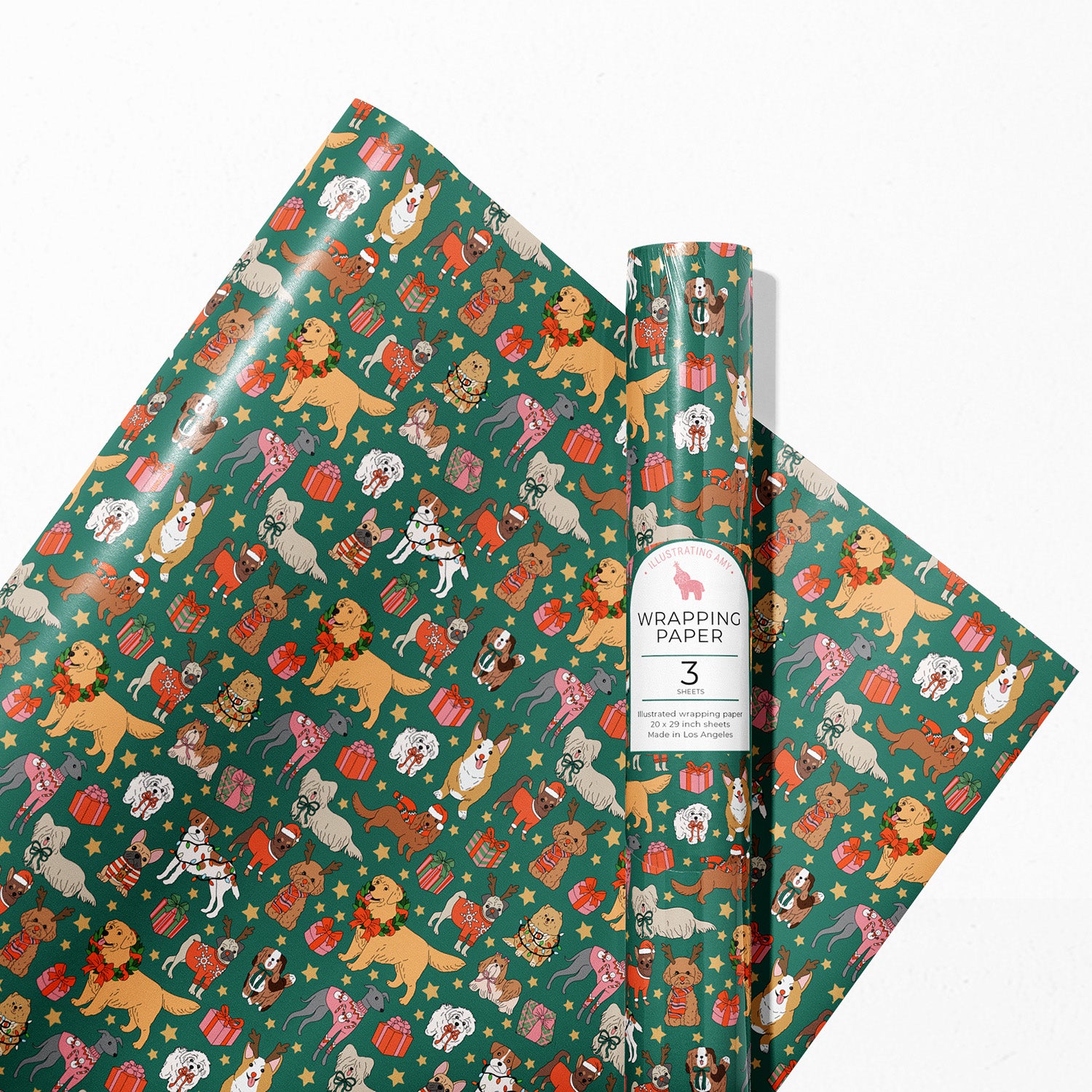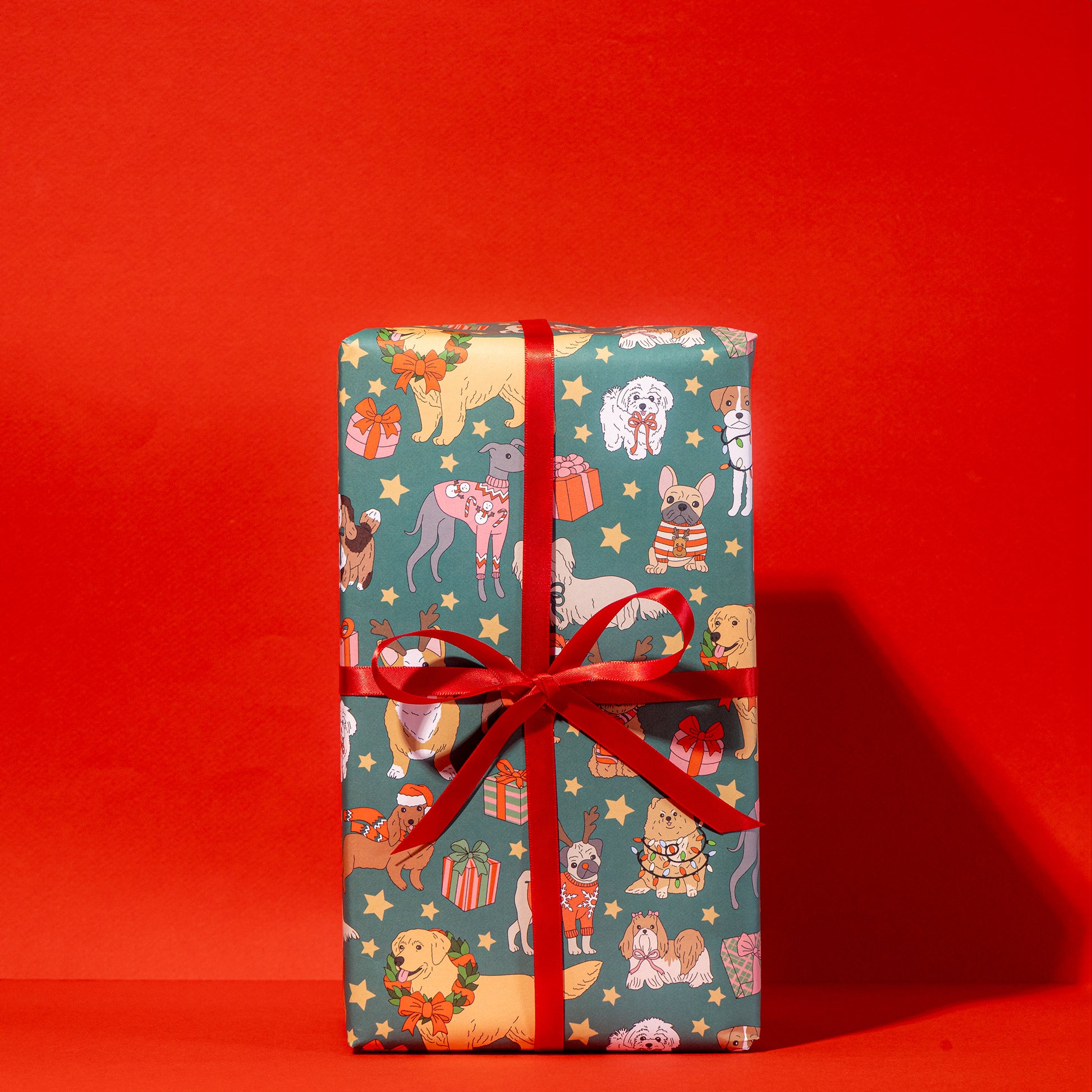 Our wrapping paper features a playful and festive design with charming illustrations of various dogs dressed in holiday sweaters, Christmas hats, and wrapped in Christmas lights, all against a vibrant background adorned with stars and gift boxes. The rich, colorful design captures the spirit of the season and adds a whimsical touch to your presents.