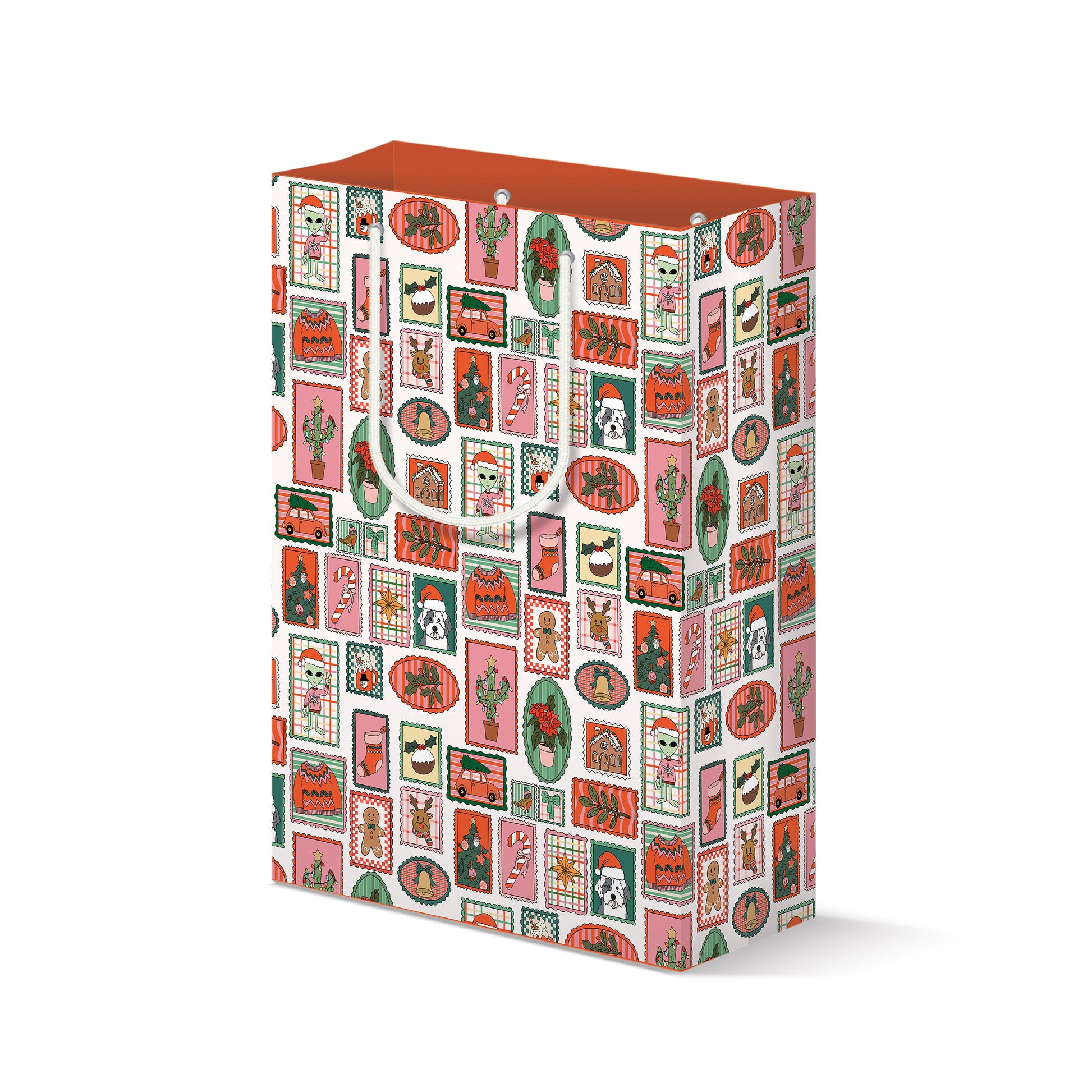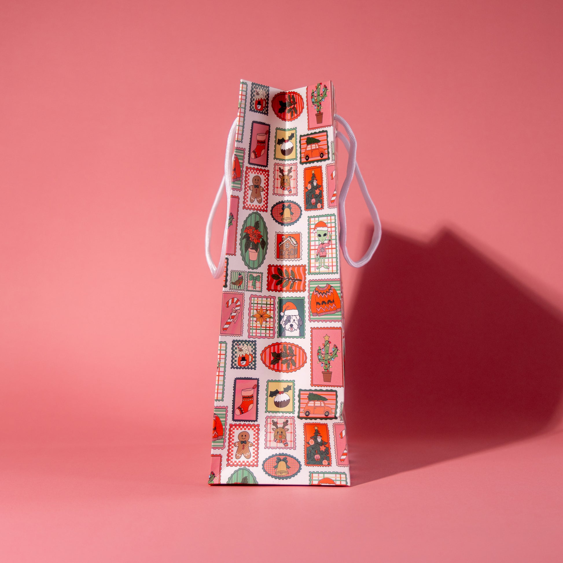 Experience the magic of Christmas with our captivating gift bag, crafted to mirror the charm of a collection of festive stamps. Each delightful illustration, from the joyful gingerbread man to the whimsical holiday alien, radiates warmth and cheer. Adorned with enchanting artwork on both sides, this gift bag is a true parcel of affection and holiday spirit. It's the perfect way to show someone special that your love and festive joy know no bounds. Make every gift a journey of love and holiday wonder with this enchanting bag!