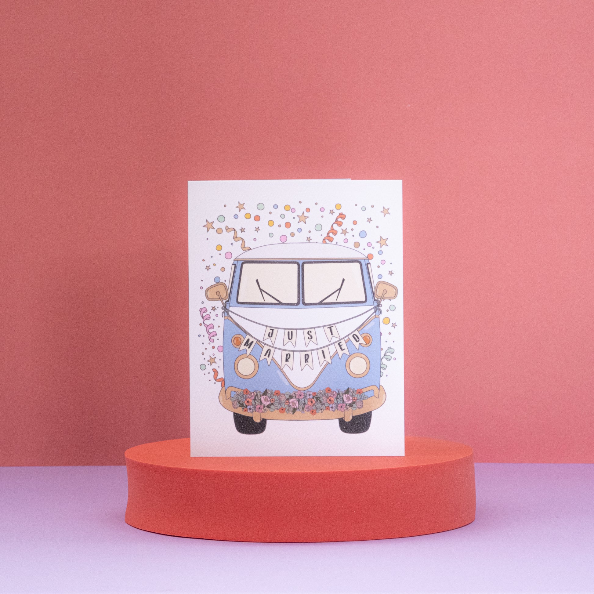 Celebrate your loved one's special day in style with this charming illustrated card. Featuring a vintage bus adorned with "Just Married" bunting and beautiful flowers, it captures the joy and excitement of a newlywed couple embarking on their adventure together.