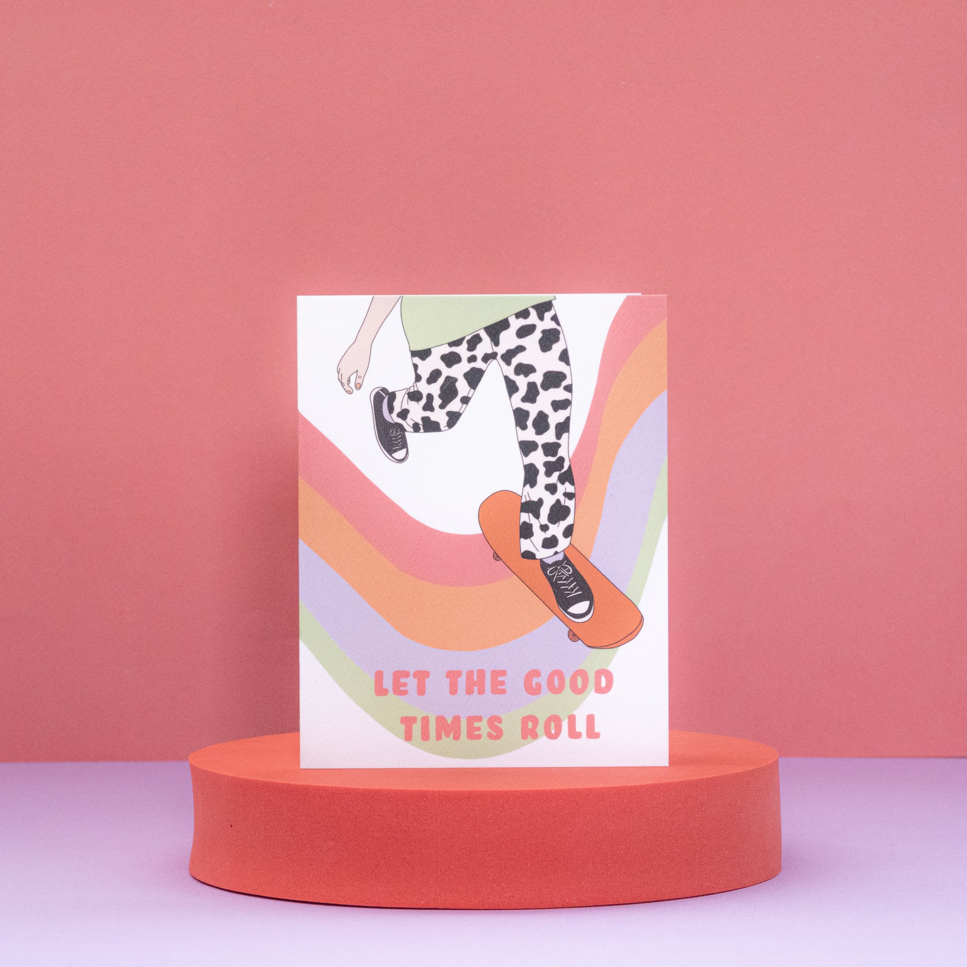 Embrace the spirit of fun and adventure with our vibrant "Good Times Roll" card! Perfect for spreading joy and positivity, this card features an illustration of a skateboarder gracefully gliding on their board. The rainbow-style background adds a burst of color and energy, reflecting the excitement and freedom of the moment with bold pink text that reads "Let the good times roll".