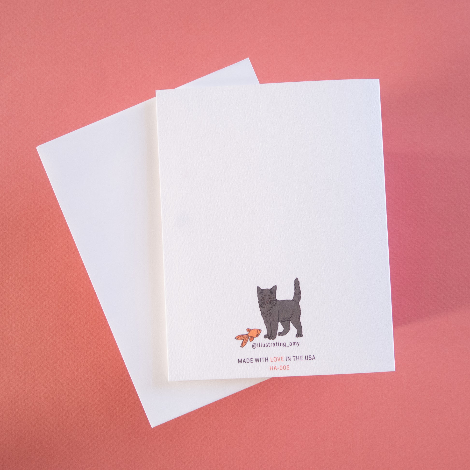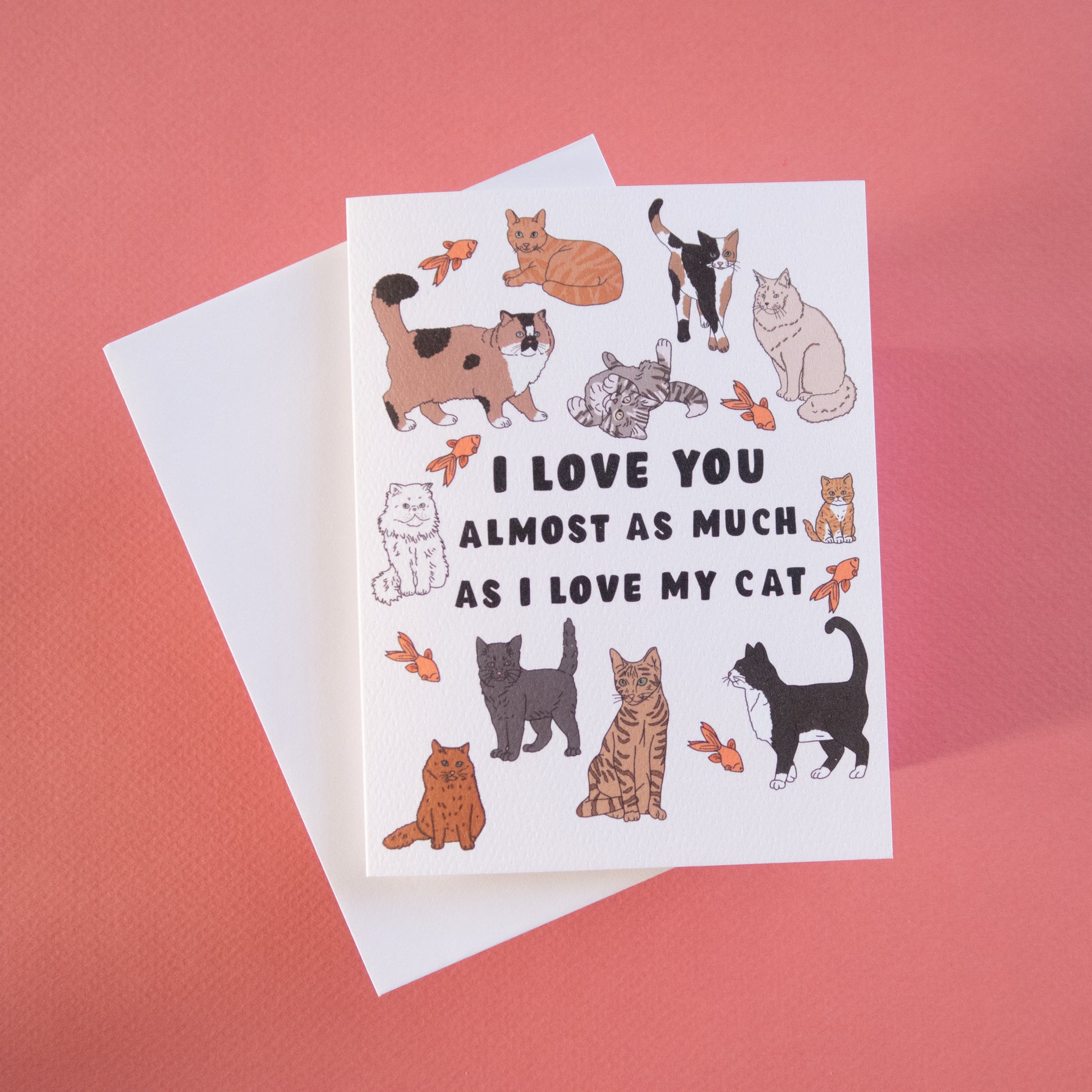 Celebrate your anniversary with our adorable greeting card, showcasing a bunch of playful cats and goldfish. With bold black text that playfully declares, 'I love you almost as much as I love my cat,' this card is the perfect way to express your affection. Happy Anniversary to the cat-loving couple!