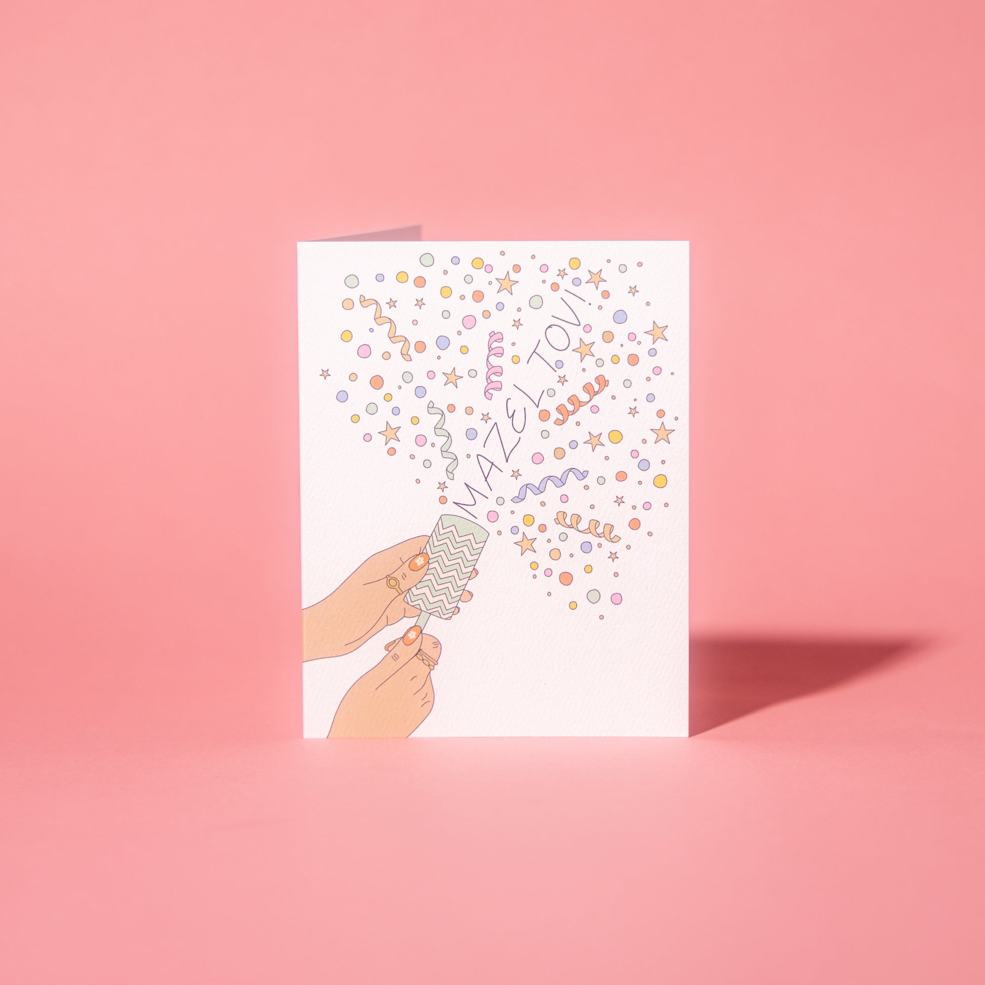 Burst into celebration with our colorful Mazel Tov card! Featuring an illustration of a hand popping a confetti cannon, this card is filled with vibrant colors and festive energy. Amidst the shower of confetti, the words "Mazel Tov" shine bright, offering heartfelt congratulations for life’s special moments, from weddings to bar mitzvahs and everything in between.