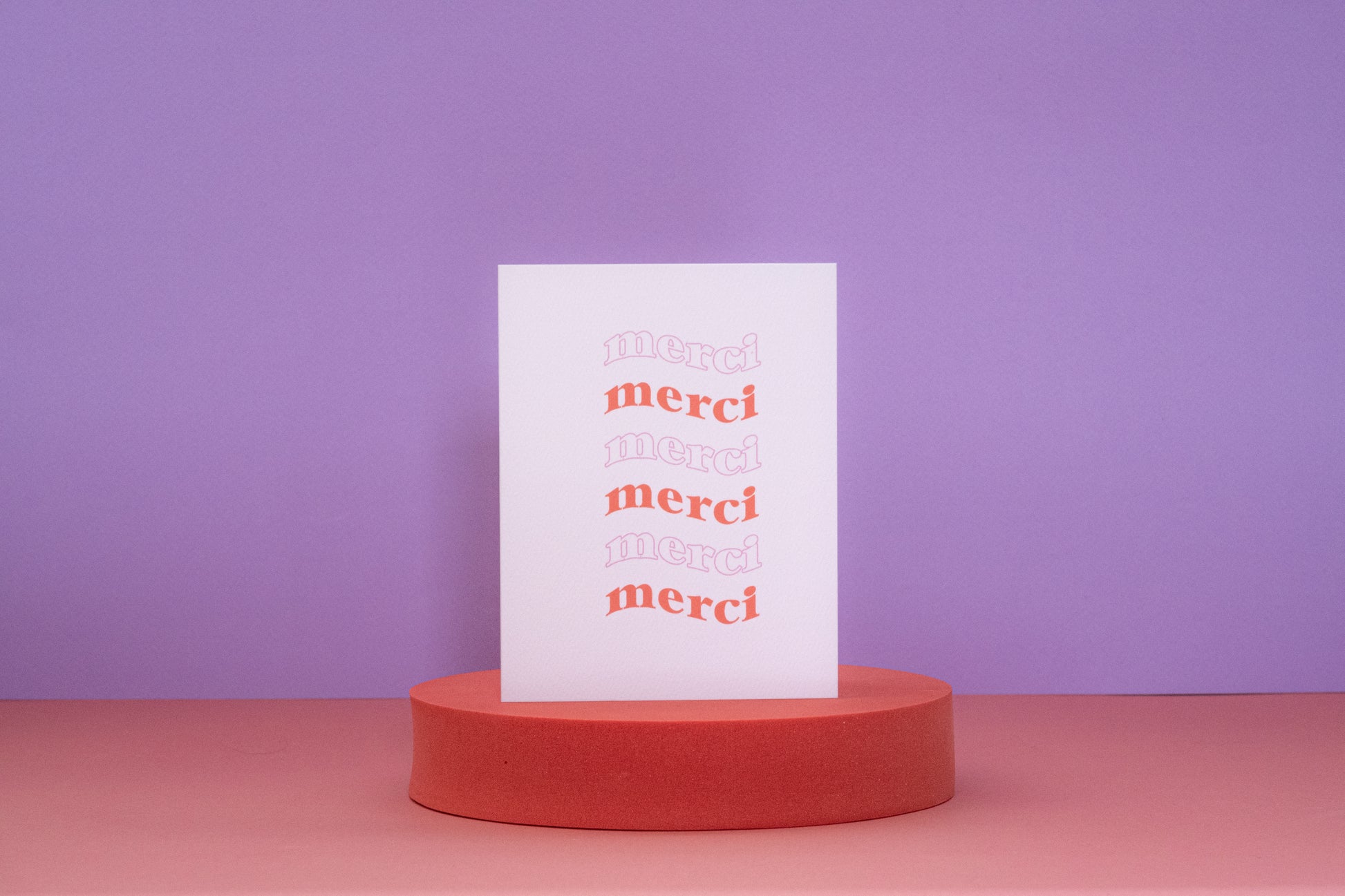 Merci, the French way to say thank you! This greeting card features a fun and playful design with pink and red wavy text. Perfect for showing your appreciation with a touch of flair.
