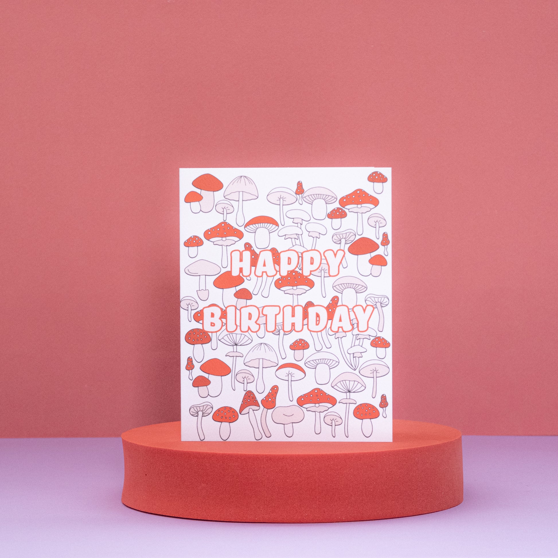 Celebrate their special day in style with our Magical Mushroom Birthday card! Featuring illustrations of mushrooms in all different shapes and sizes with contemporary white and red text that reads "Happy Birthday"