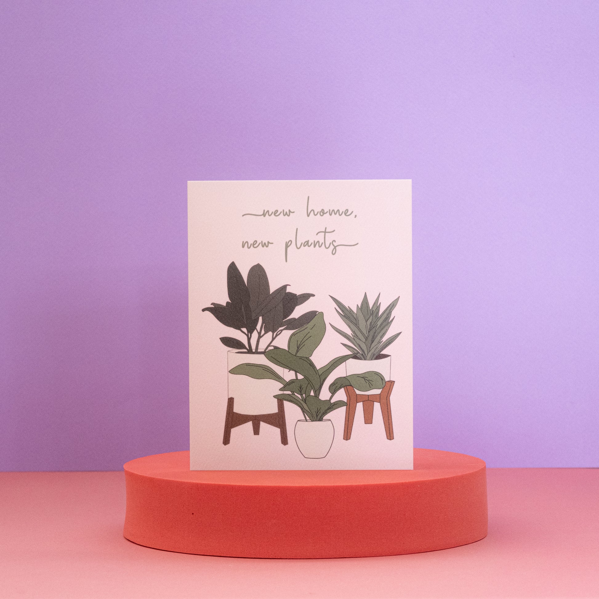Welcome their green thumbs to a new home with our Plant Lover's New Home card! Featuring a delightful illustration of lush plants against a pale pink background, this card is perfect for your plant-loving friends. The text reads "New Home, New Plants," capturing the excitement of filling their new space with greenery and fresh beginnings.