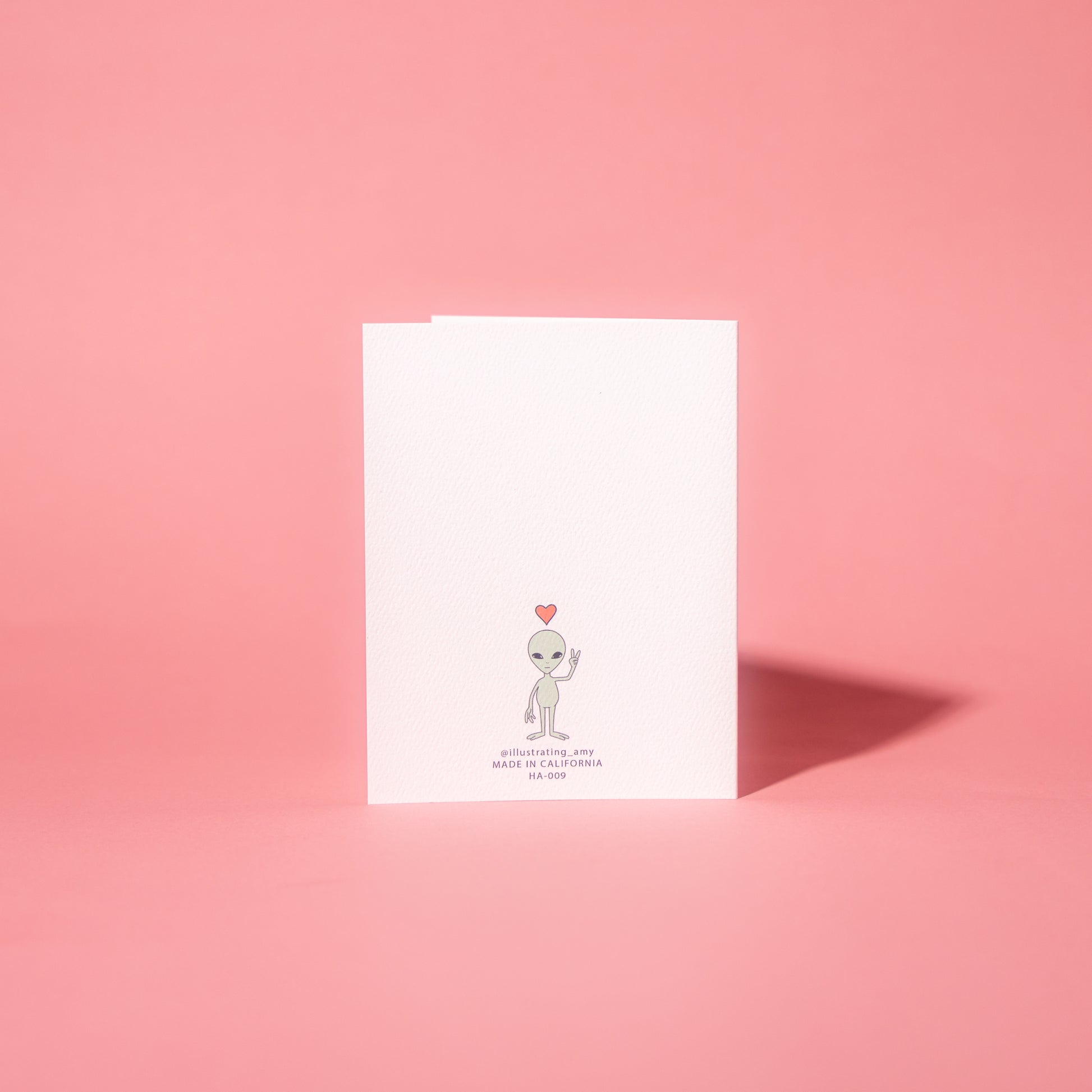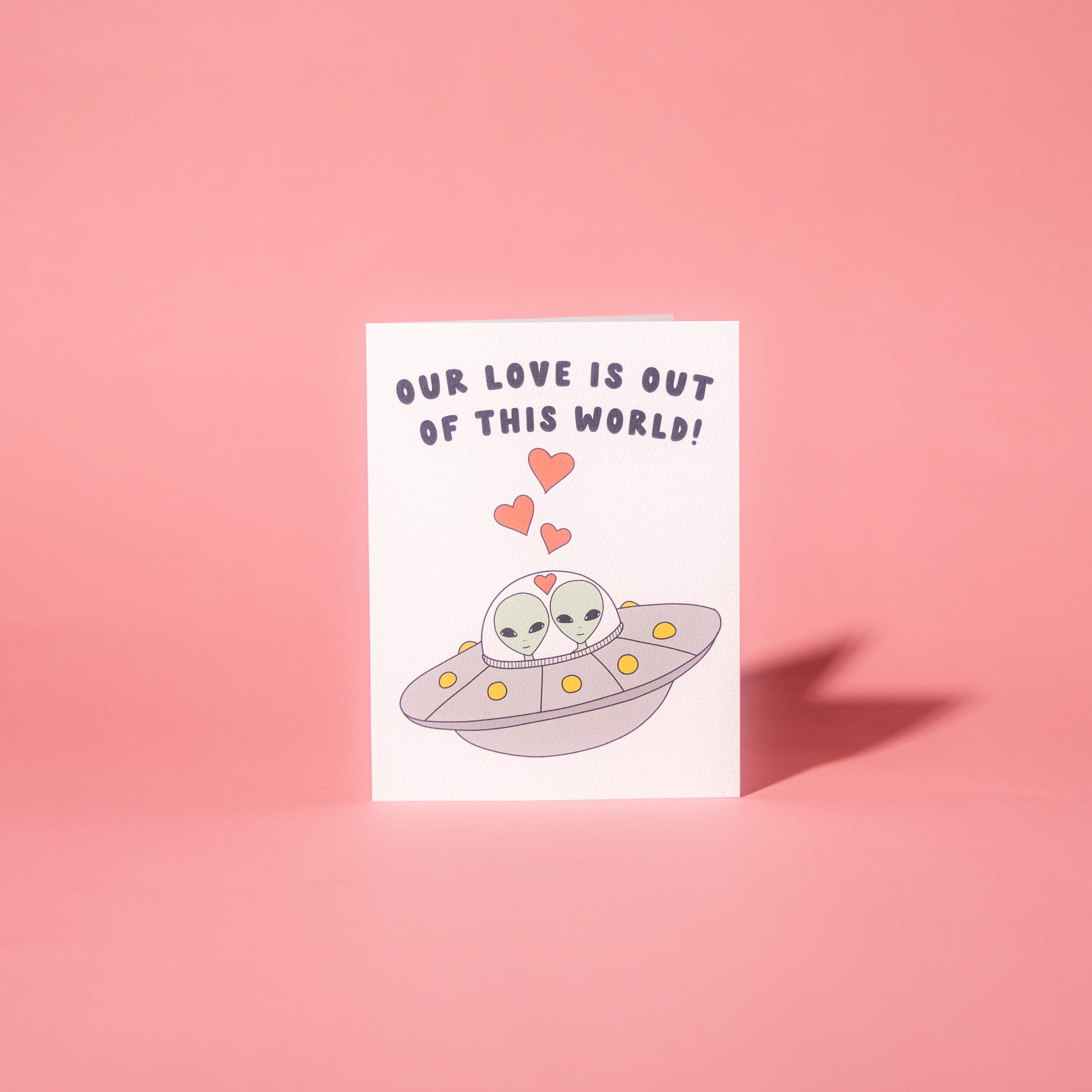 Send some intergalactic love with this quirky and fun card featuring two adorable aliens in a spaceship! Perfect for Valentine's Day or any occasion when you want to express how extraordinary your love is. With playful heart details floating above the UFO, this card is bound to make your loved one smile. The retro, minimalist design paired with bold black text and a vibrant red envelope makes it a unique way to say your love goes beyond the stars!