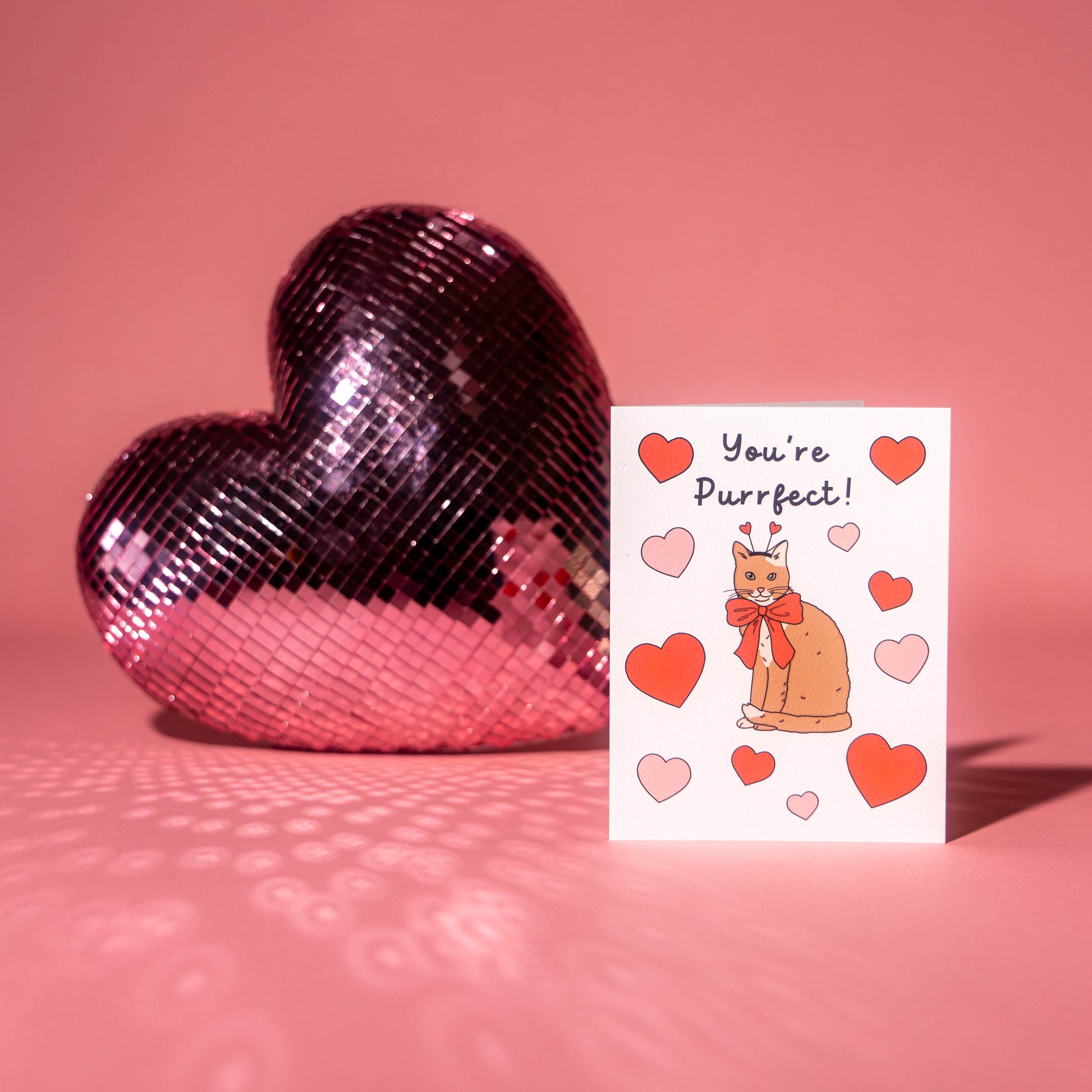 Celebrate love with a playful twist! This adorable card features a charming cat wearing a big red bow and a heart-topped headband, surrounded by sweet floating hearts. The bold black text reads, "You’re Purrfect," making it the ideal choice for Valentine’s Day, anniversaries, or simply reminding someone how special they are.