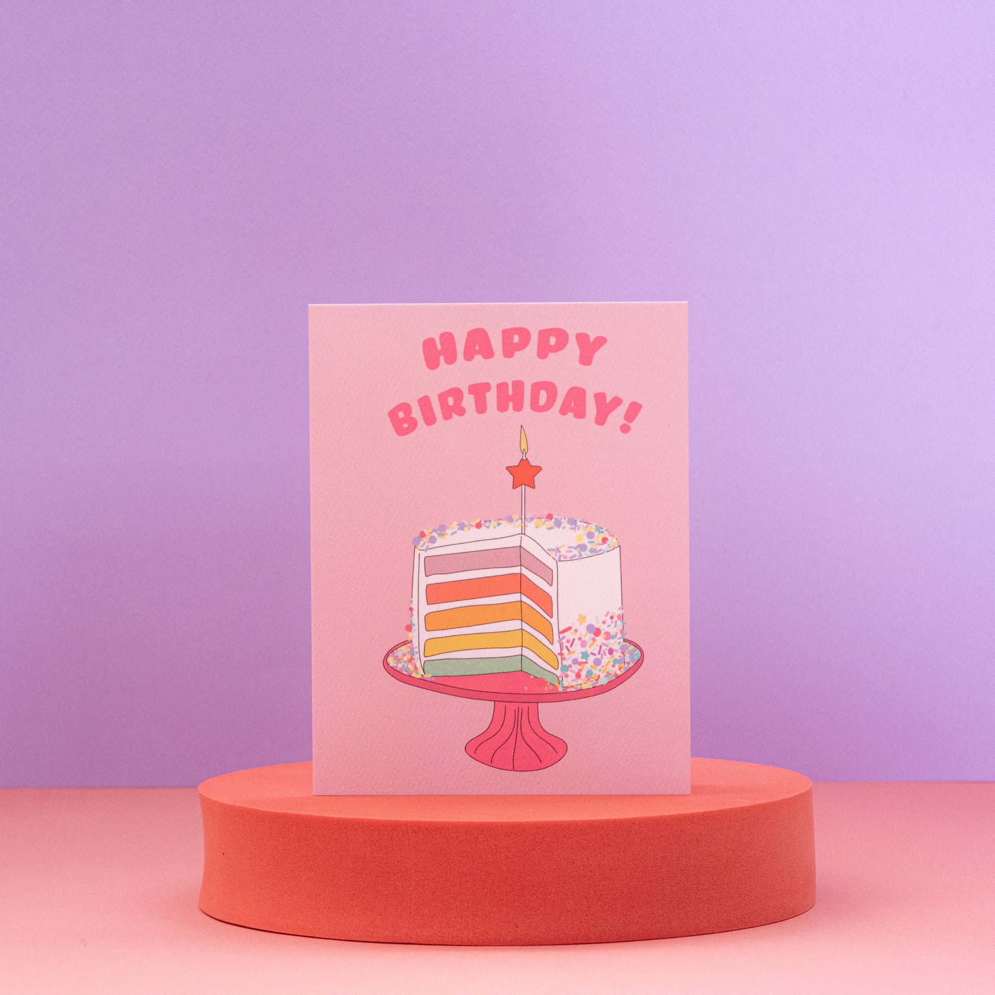 Looking for a sweet and colorful way to wish them a happy birthday? Our Rainbow Cake Happy Birthday card is the perfect choice! Featuring an adorable illustration of a rainbow cake with sprinkles, set against a bright pink background, this card is sure to bring a smile to their face.