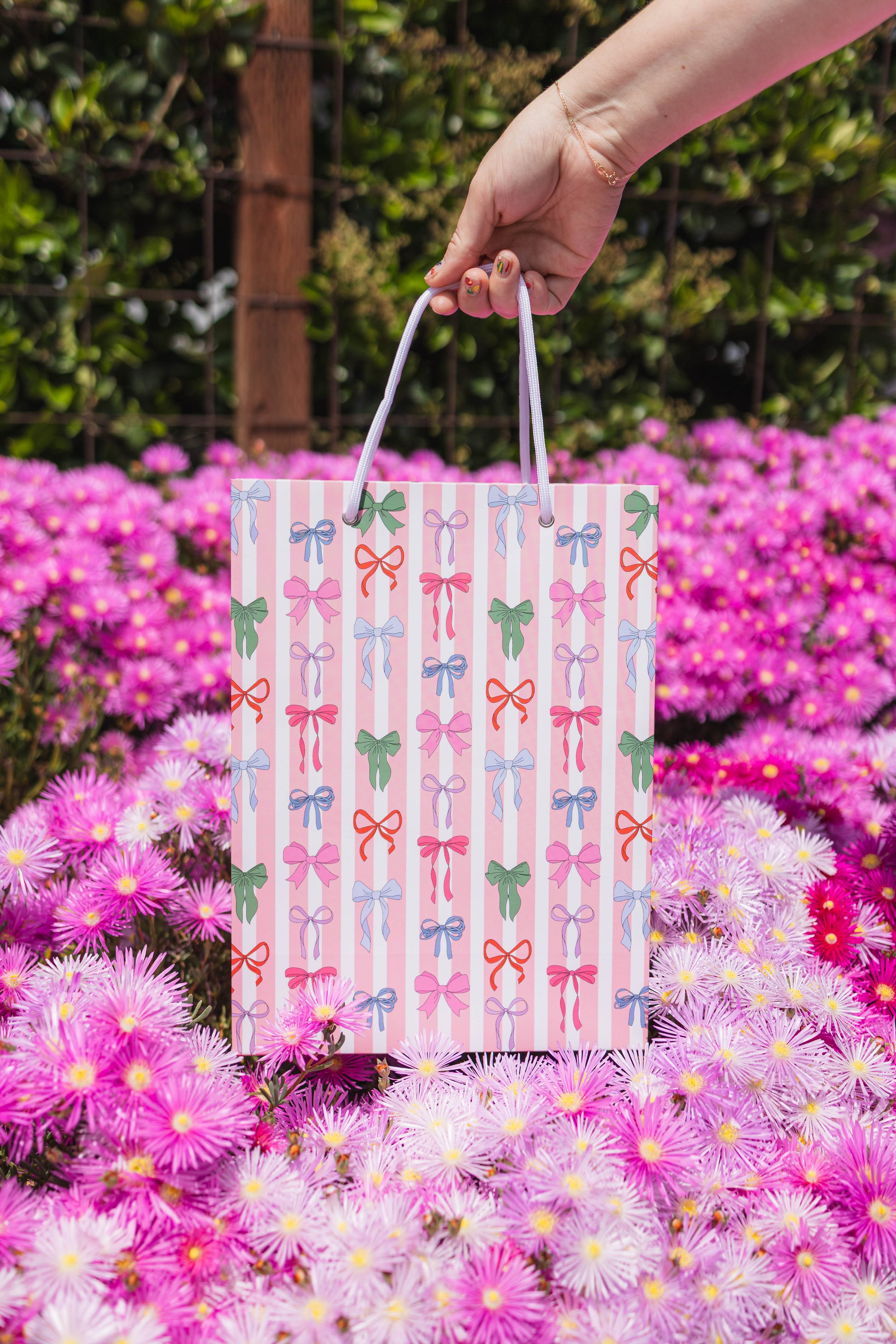 Add a touch of sweetness to any celebration with this charming Bow Striped Gift Bag! Featuring a vintage-inspired pink and white striped background, this bag showcases lots of different styled illustrated bows. Perfect for birthdays and special occasions, this sturdy gift bag comes with soft rope handles for easy carrying.
