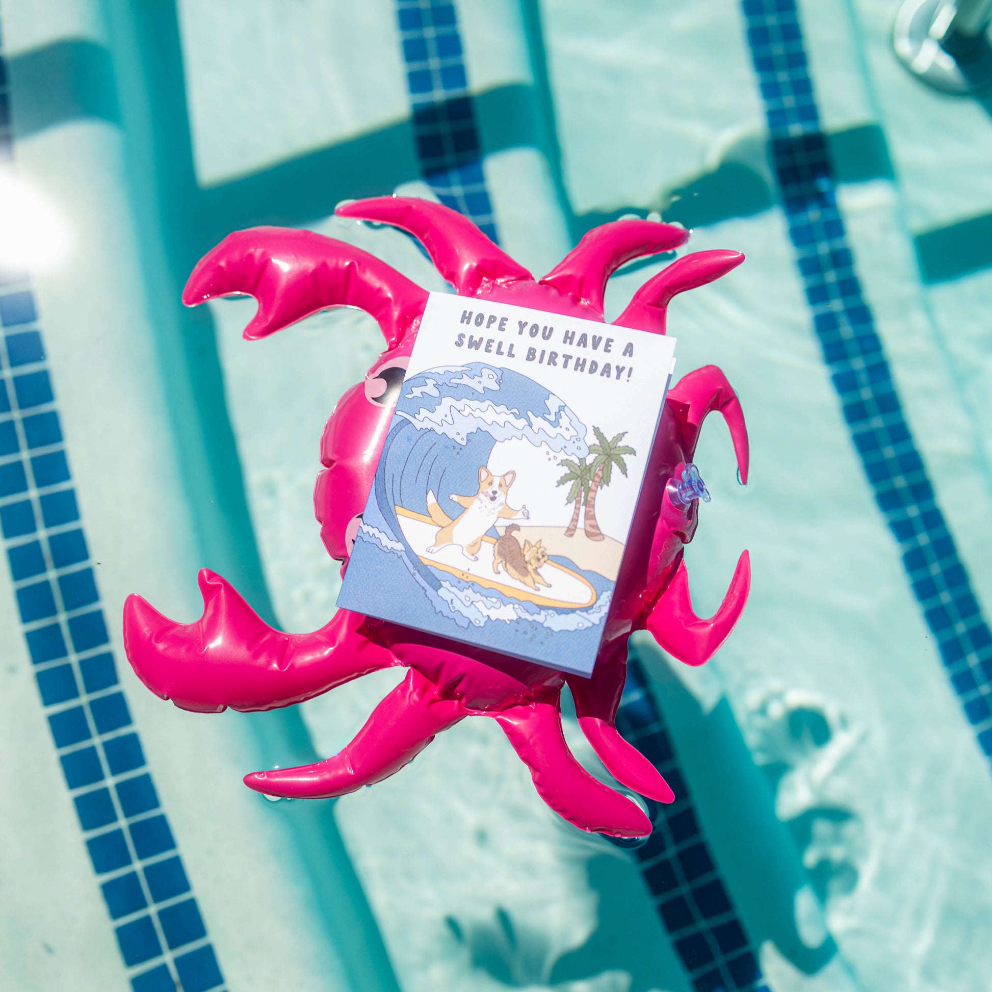 Hope You Have a Swell Birthday! Make waves on someone’s special day with this playful birthday card featuring two adorable pups catching a big one! A cheerful corgi and scruffy terrier ride the surf together under sunny skies and swaying palms. Perfect for dog lovers, beach bums, or anyone who appreciates a good pun, this card is sure to bring a smile.