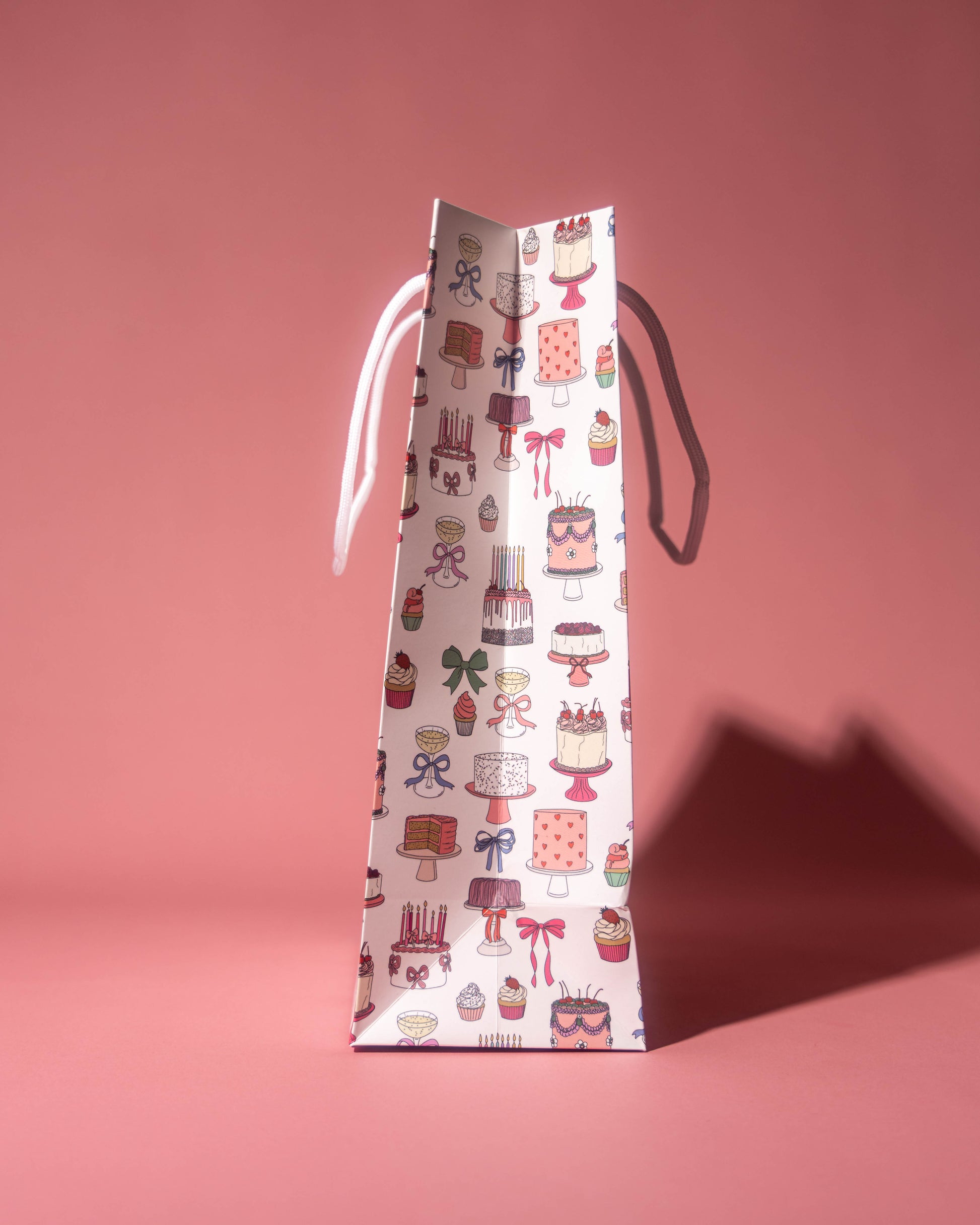 Make every celebration extra special with our Sweet Celebration Gift Bag! Adorned with hand-illustrated cakes, cupcakes, bows, and candles, this whimsical design is perfect for birthdays, anniversaries, and any occasion that calls for something sweet. The charming pink and red tones add a festive touch, while the striped interior and sturdy rope handles provide a premium feel.