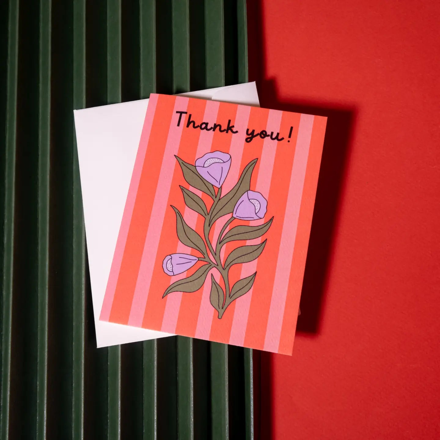 Express Gratitude in Full Bloom! Our Thank You greeting card, with a vibrant red and pink striped background and adorned with charming purple flowers and lush green leaves, is a blooming testament to your heartfelt appreciation. Say 'Thank You' with a touch of elegance and a burst of color.