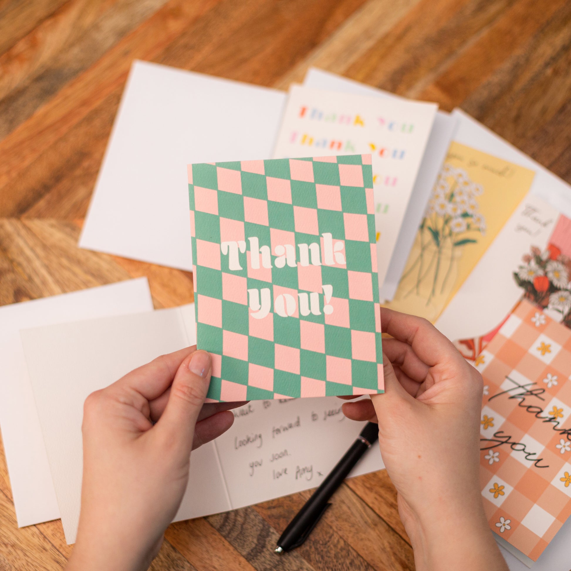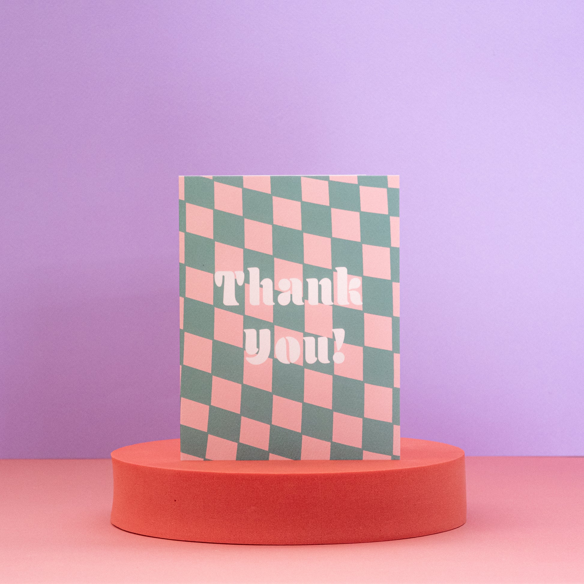 Express your gratitude with this bold and cheerful "Thank you!" greeting card. The eye-catching pink and green checkered background, along with the white text, make this card a great way to show your appreciation in style. • Size: 4.25 x 5.5 inch