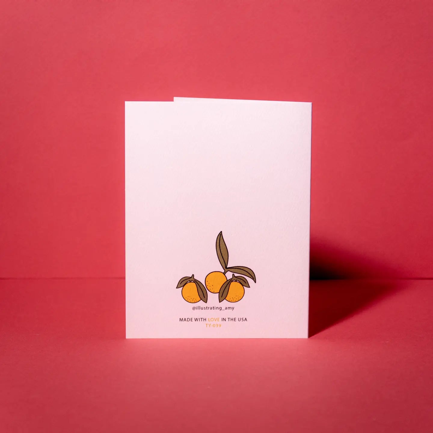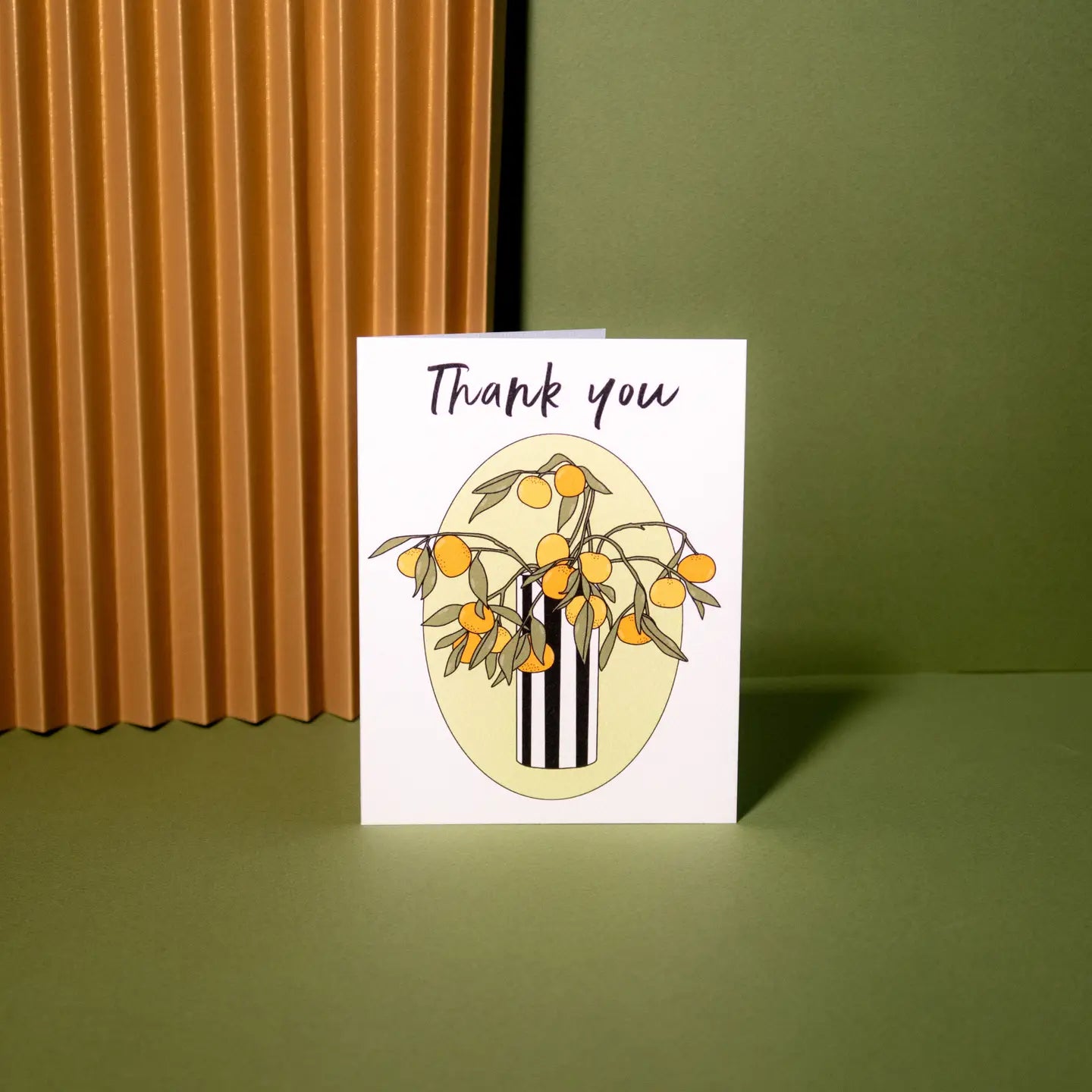 Express your gratitude with our 'Citrus Bloom' Thank You card! Featuring a timeless black and white vase cradling vibrant oranges on branches within an elegant green oval cutout. This card is a tasteful way to say 'Thank You' with a touch of sophistication.