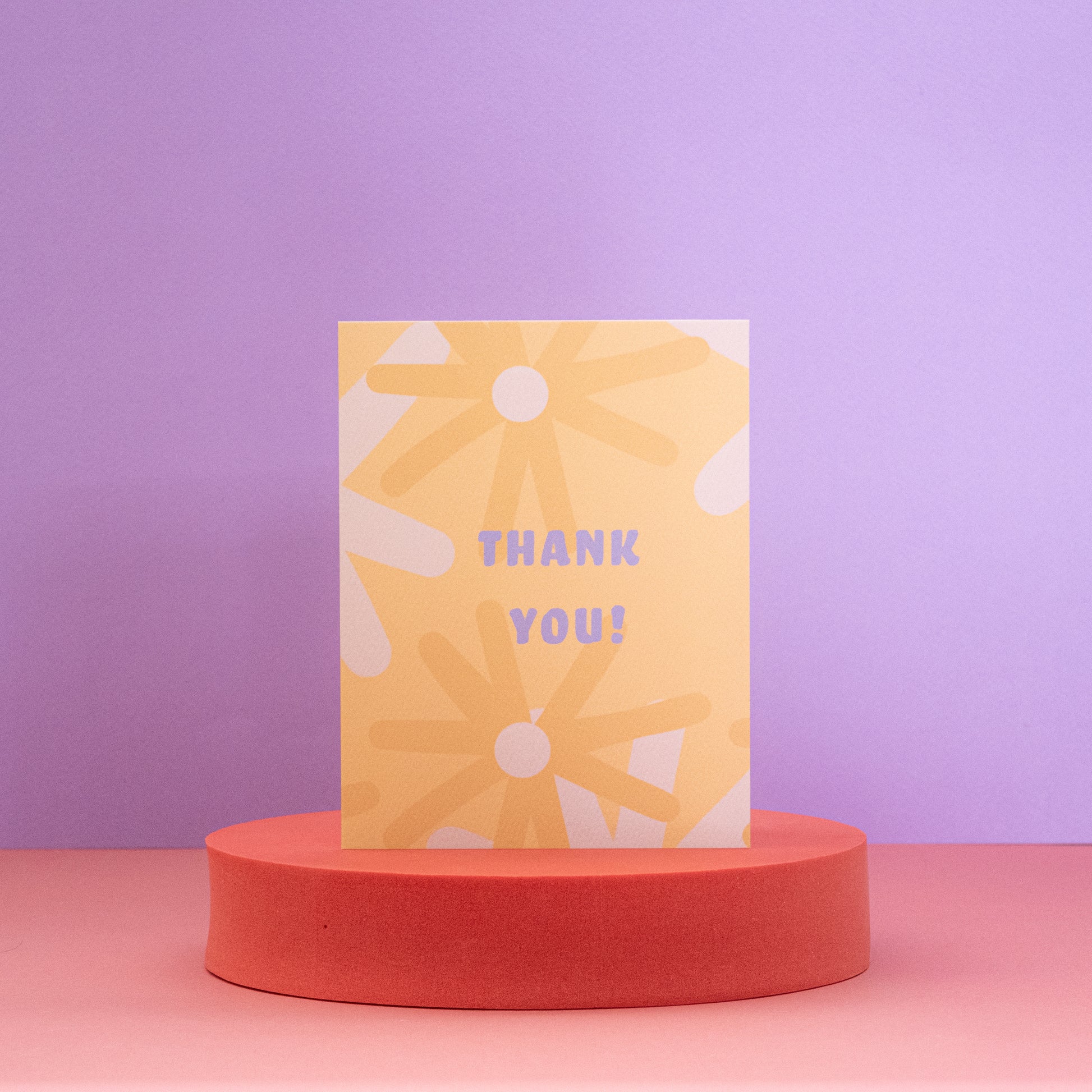 Send a heartfelt message of appreciation with our Thank You card. Featuring lovely yellow and cream flowers on a bright yellow background, and cheerful blue text that reads "Thank You"