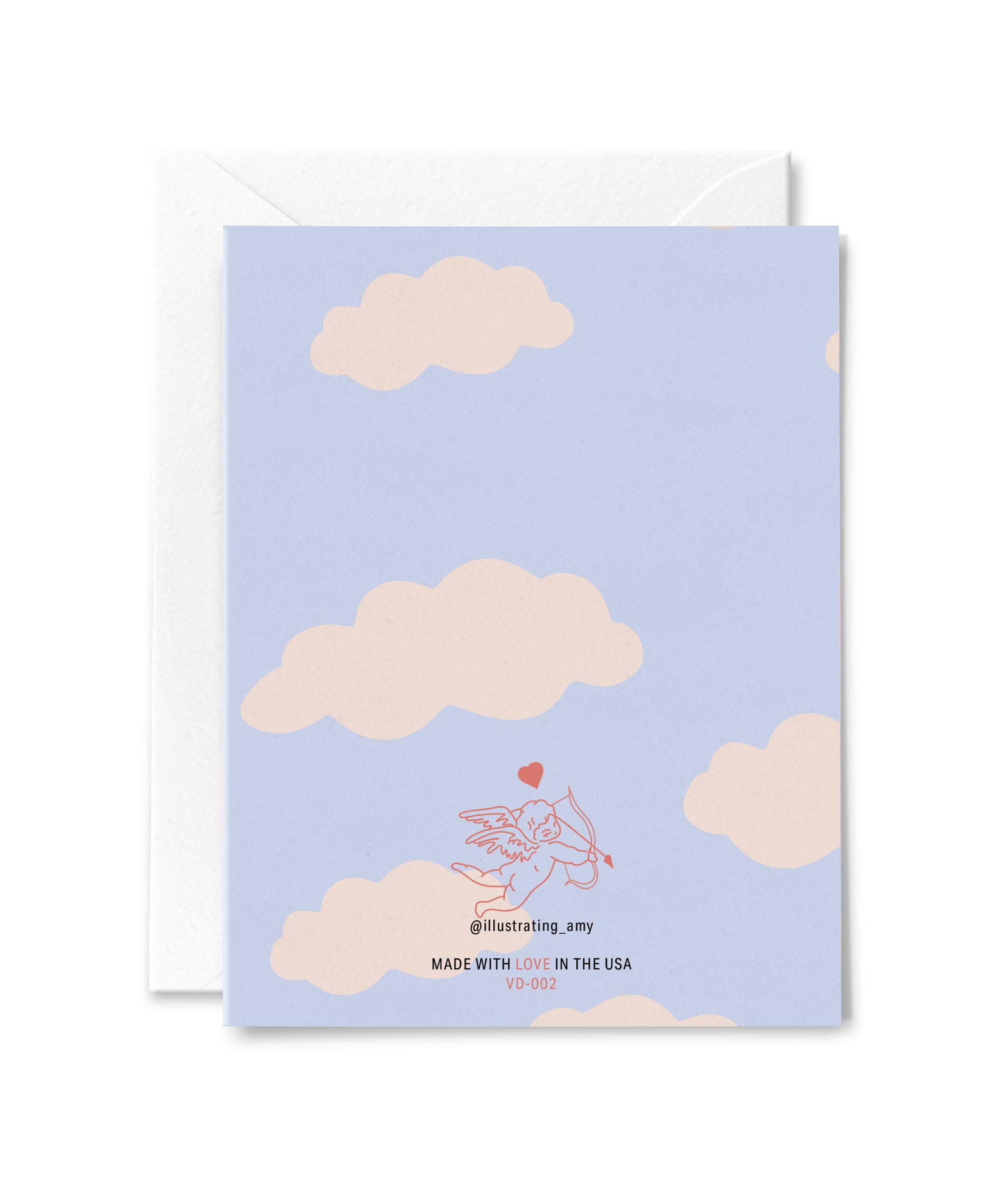 Love on Cloud 9! Celebrate the magic of love with this whimsical Valentine's Day card. Featuring an enchanting illustration of a retro neon sign that reads 'Happy Valentine's Day' against a backdrop of dreamy blue skies and fluffy candy floss clouds.