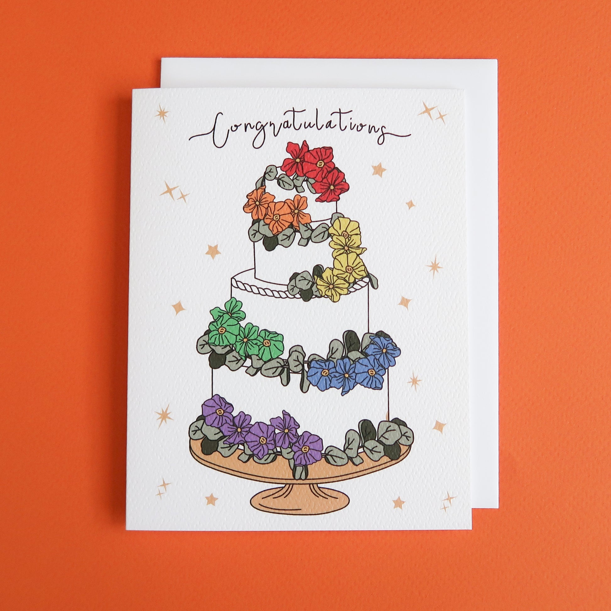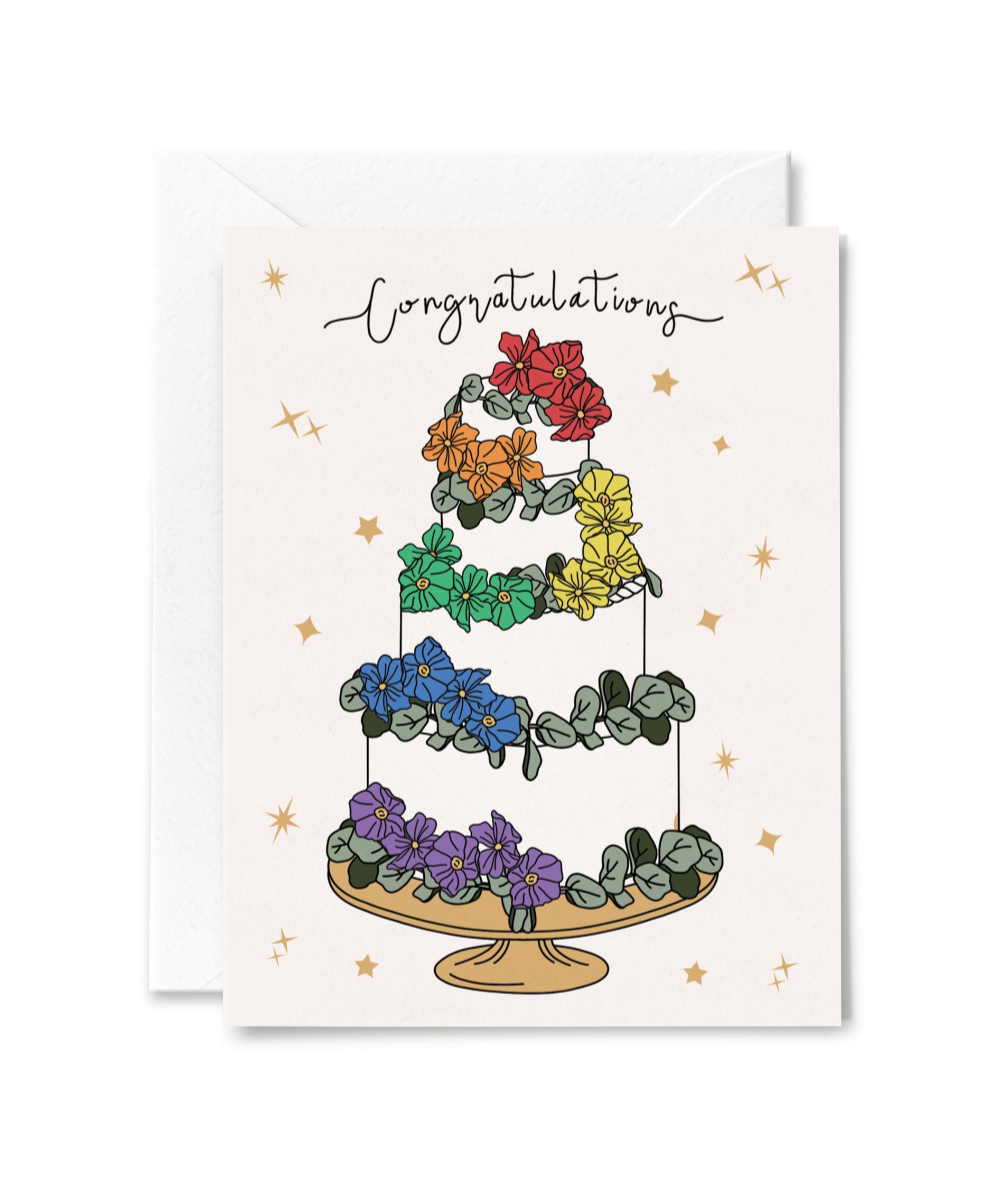 Congratulations on their special day! Our Rainbow Floral Wedding Cake card is the perfect way to celebrate their love and send your warm wishes. With a cream background and a sprinkling of gold stars, this card features an illustration of a beautifully decorated wedding cake adorned with vibrant rainbow-colored flowers. The black text elegantly reads "Congratulations"
